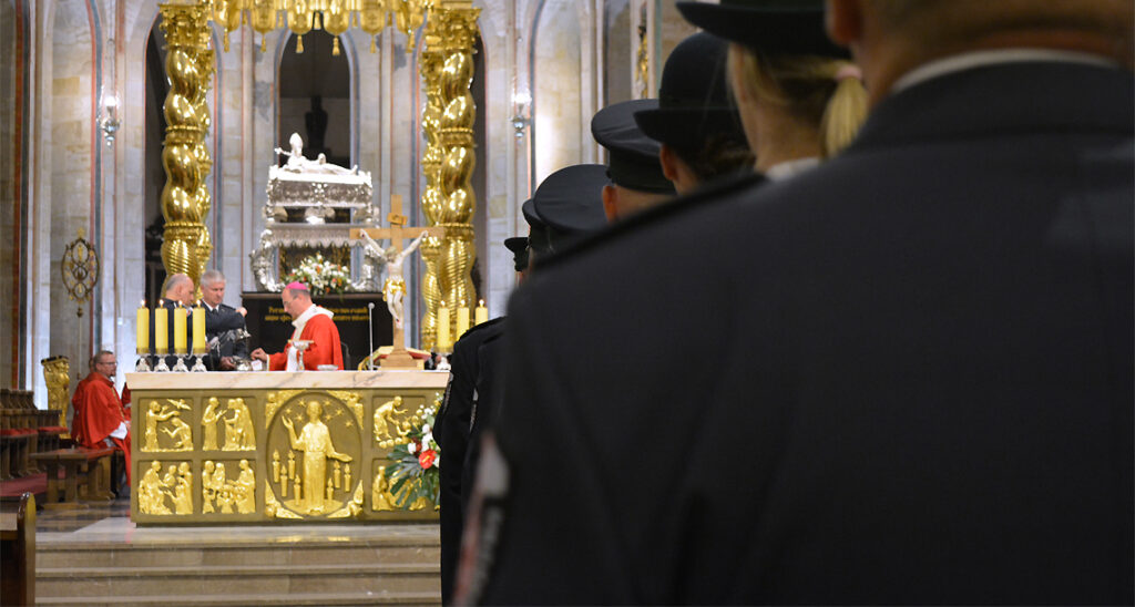W Mszy św. uczestniczyli przedstawiciele władz lokalnych i wojewódzkich, poczty sztandarowe służb mundurowych oraz pielgrzymi, którzy tego dnia przybyli do bazyliki prymasowskiej – jednego z kościołów jubileuszowych archidiecezji gnieźnieńskiej. Oprawę muzyczną uroczystości przygotowała Orkiestra Reprezentacyjna Sił Powietrznych.