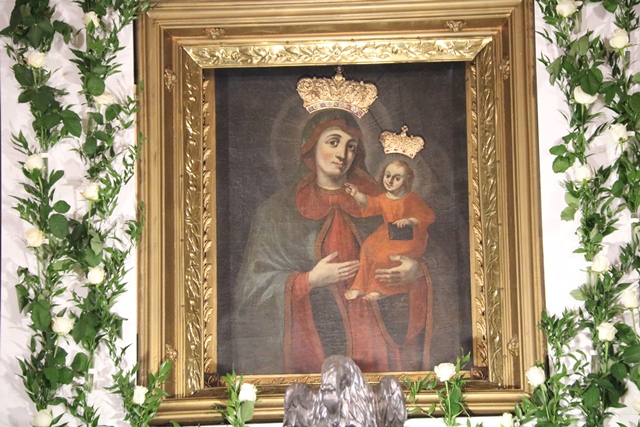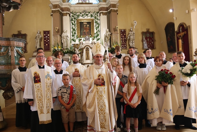 W ołtarzu głównym mieści się obraz Matki Bożej z Dzieciątkiem z XVII w. namalowany na płótnie przez nieznanego autora (ozdobiony sukienką drewnianą z 1 poł. XVIII w.), zasłonięty przez obraz Wniebowzięcia Najświętszej Maryi Panny z XIX w. Jest on od wieków celem pielgrzymek (15 sierpnia) i jako uznany za cudowny został koronowany 13 sierpnia 1972 roku przez prymasa Stefana Wyszyńskiego za pozwoleniem papieża Pawła VI.
