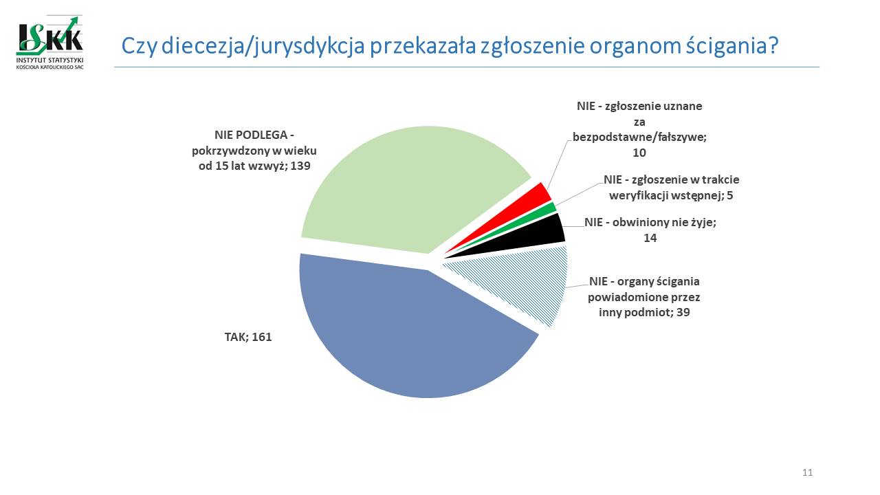 Spośród zgłoszonych jurysdykcjom kościelnym spraw dotyczących osób pokrzywdzonych poniżej 15 roku życia, 148 (86%) zostało zgłoszonych państwowym organom ścigania. W 113 przypadkach zgłoszeń tych dokonały diecezje i zakony, a w 35 przypadkach państwowe organy ścigania zostały powiadomione przez inny podmiot. Spośród spraw dotyczących osób poniżej 15 roku życia, które nie zostały zgłoszone państwowym organom ścigania, 13 (8%) dotyczyło duchownych lub zakonników, którzy w momencie oskarżenia już nie żyli, 8 (5%) spraw zgłoszonych jurysdykcjom kościelnym nie przekazano do prokuratury ze względu na uznanie ich za bezpodstawne lub fałszywe. 4 (2%) zgłoszeń w momencie zbierania danych było na etapie weryfikacji wstępnej.