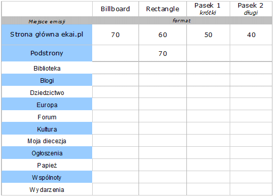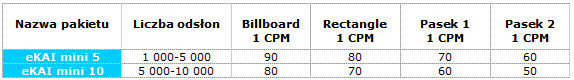 Powyższe kwoty odnoszą się do 1000 odsłon. Przy zakupie pakietu eKAI 1+1 dodatkowa kampania w formacie Pasek 2 w cenie 30 zł/1000 odsłon. Realizujemy kampanie powyżej 10 tys. odsłon. Kampanie powyżej tej wartości są realizowane w pakiecie eKAI mini.