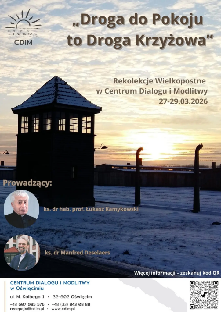 W Centrum Dialogu i Modlitwy w Oświęcimiu w dniach 27–29 marca 2026 r. odbędą się rekolekcje wielkopostne pod hasłem: „Droga do Pokoju to Droga Krzyżowa”. Spotkanie potrwa do Niedzieli Palmowej. Rekolekcje poprowadzą: kapłan archidiecezji krakowskiej, konsultor Rady ds. Dialogu Religijnego Konferencji Episkopatu Polski, profesor i długoletni wykładowca UPJPII ks. prof. Łukasz Kamykowski oraz niemiecki duszpasterz od lat pracujący w Centrum – ks. dr Manfred Deselaers.