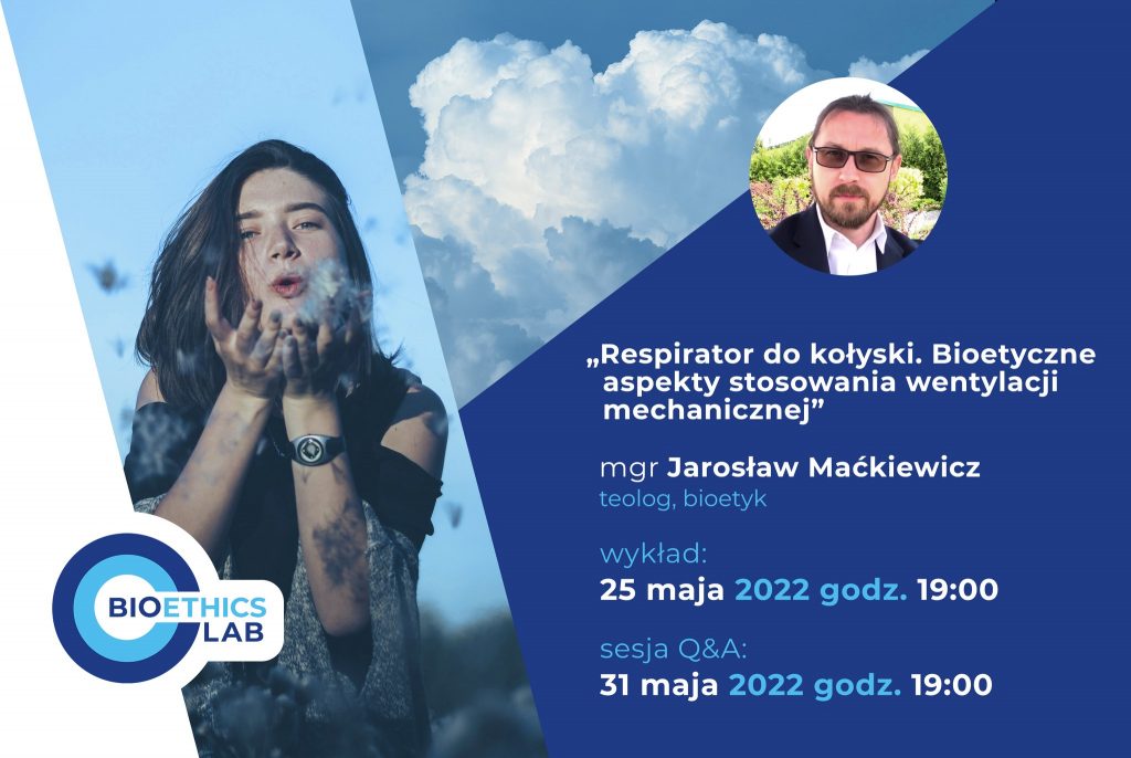 Wykład „Respirator do kołyski. Bioetyczne aspekty stosowania wentylacji mechanicznej” będzie dostępny od środy 25 maja od godz. 19.00, a we wtorek 31 maja o godz. 19.00 zaplanowana jest sesja Q&A, w czasie której ekspert będzie na żywo odpowiadał na nadesłane pytania. Oba wydarzenia zostaną udostępnione w serwisie YouTube na kanale Interdyscyplinarnej Akademii Bioetyki. Szczegóły na stronie akademiabioetyki.pl.