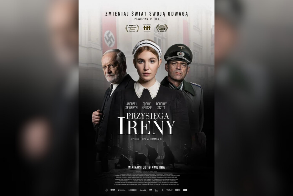 „Przysięga Ireny” to prawdziwa, przejmująca opowieść o zachowaniu człowieczeństwa w nieludzkich czasach II wojny światowej. W głównych rolach zobaczymy gwiazdy światowego kina: Sophie Nelisse i Dougraya Scotta. W obsadzie polsko-kanadyjskiej koprodukcji znaleźli się również: Andrzej Seweryn, Filip Kosior, Rafał Mohr, Eliza Rycembel, Tomasz Tyndyk, Irena Melcer, Eryk Kulm Jr, Mateusz Mosiewicz, Rafał Maćkowiak, Maciej Nawrocki, Zuza Puławska, Krzysztof Szczepaniak, Aleksandar Milićević i Agata Turkot. Reżyserką obrazu jest wielokrotnie nagradzana Louise Archambault, natomiast za zdjęcia odpowiada Paul Sarossy. Scenariusz napisał Dan Gordon, który jest również autorem sztuki o Irenie Gut-Opdyke, która zdobyła serca nowojorskiej widowni offbroadwayowskiej sceny w 2008 roku. Światowa premiera filmu miała miejsce na 48. Międzynarodowym Festiwalu Filmowym w Toronto.