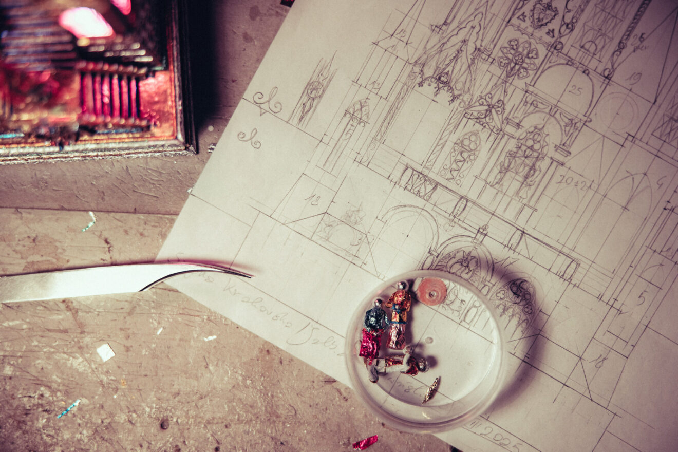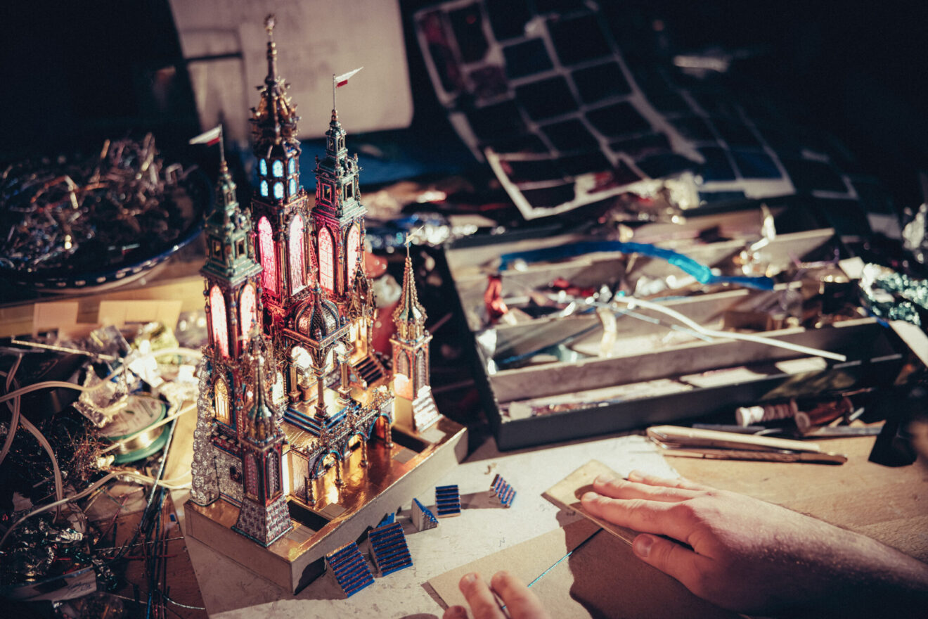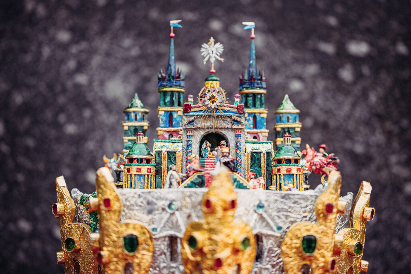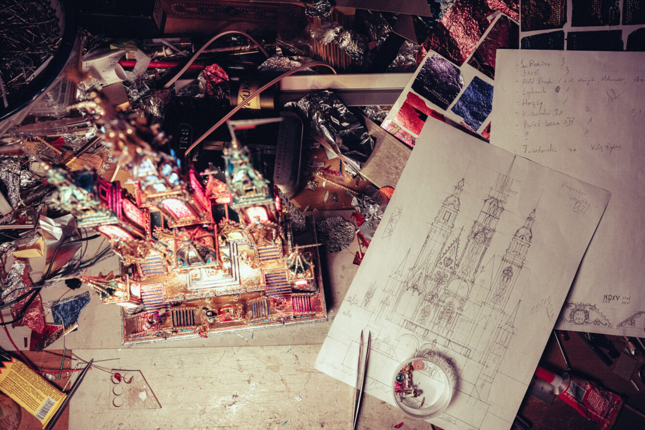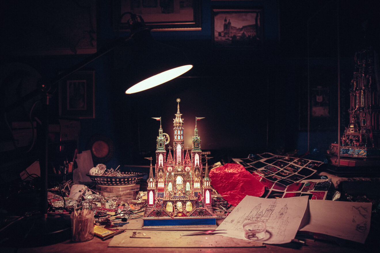 Prezentujemy też galerię zdjęć z pracowni Jakuba Zawadzińskiego, krakowskiego szopkarza. Tegoroczna szopka zawiera elementy architektury katedry wawelskiej, konfesje św. Stanisława, grobowce królewskie.