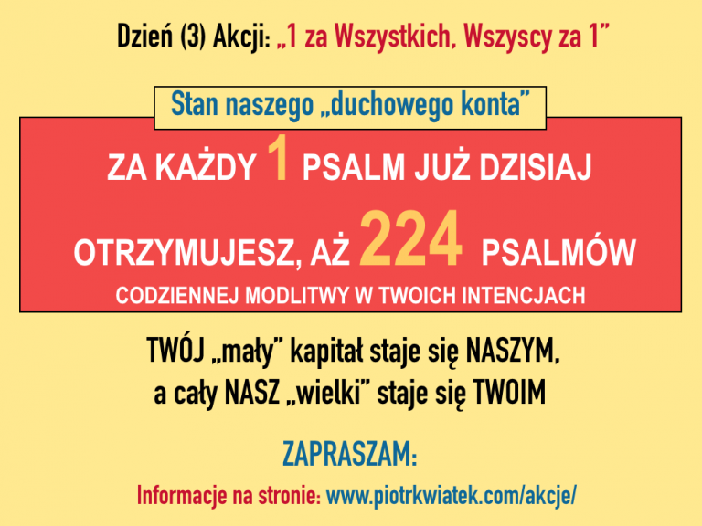 Jest to codzienna modlitwa choćby jednym zdaniem z danego psalmu. Nie trzeba czytać całości każdego dnia. Trzeba jednak pamiętać o intencji za wszystkich uczestników projektu. – Psalmy są najpiękniejszą modlitwą. Dziś, w tak trudnym czasie, potrzebujemy jej bardziej niż kiedykolwiek – dodaje br. Kwiatek.