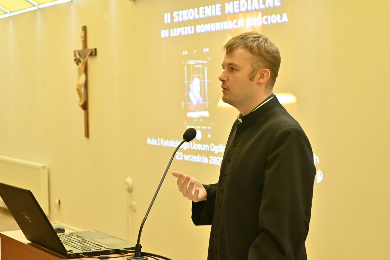 Pierwszy referat „Trzy kroki do zrobienia lepszego zdjęcia i kilka słów o tym, kiedy mogę użyć cudzego (lub swojego!) zdjęcia do publikacji” przedstawił Kamil Szumotalski. Jako zawodowy fotograf przedstawił praktyczne wskazania w tworzeniu fotorelacji z wydarzeń religijnych w parafii. Pokazał dlaczego warto robić dobre zdjęcia i inwestować w fotografa.