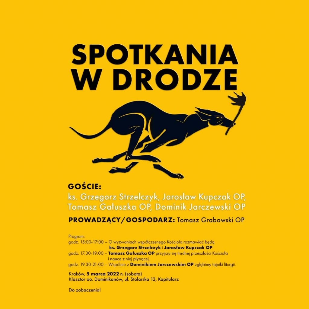 5 marca 2022 r. Wydawnictwo W drodze zaprasza na inauguracyjne spotkania autorskie do Krakowa (klasztor oo. Dominikanów, ul. Stolarska 12, Kapitularz). Wezmą w nich udział: ks. Grzegorz Strzelczyk, Jarosław Kupczak OP, Tomasz Gałuszka OP, Dominik Jarczewski OP.