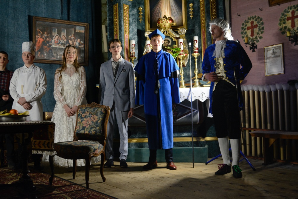 Fot. Archiwum Diecezji Bielsko-ŻywieckiejMłodzież ze starowiejskiej parafii Podwyższenia Krzyża Świętego wraz ze swoim proboszczem ks. dr. Szymonem Traczem przygotowali adaptację „Zemsty” wg Aleksandra Fredry. Dzięki profesjonalnej grze aktorskiej i barwnej scenografii widzowie mogli jeszcze raz zanurzyć się w klimat sarmackiej Polski końca XVIII w. Barwne postacie Papkina, Cześnika, Rejenta, Podstoliny, Klary i Wacława czy Dyndalskiego stały się zwierciadłem ludzkich przywar i małostek, które w wesołej konwencji mogą po przemyśleniu być dobrym wprowadzeniem do nadchodzącego wielkiego postu.
