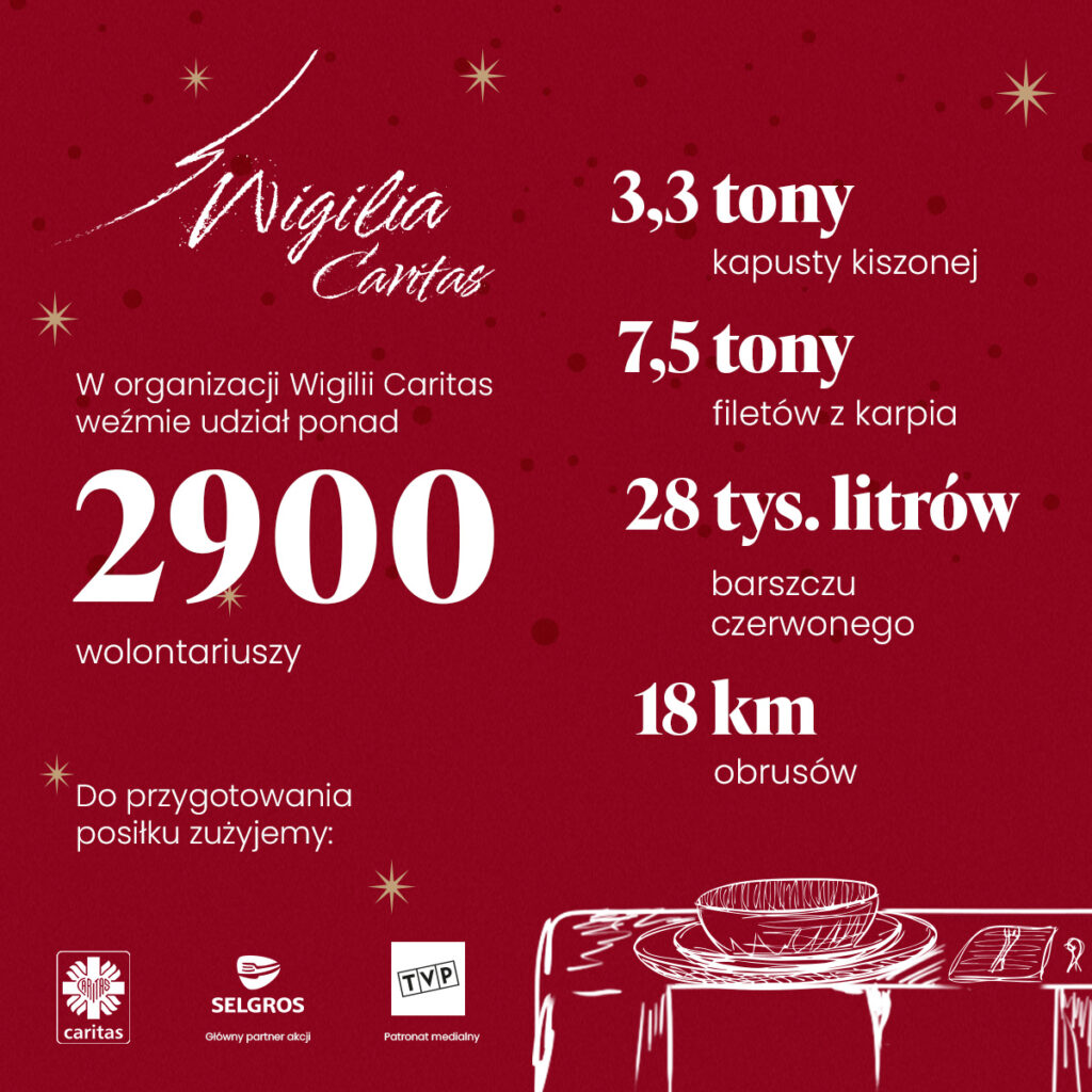 Wigilia Caritas to wydarzenie o ogromnej skali logistycznej, ale przede wszystkim to spotkanie z drugim człowiekiem przygotowane przez ludzi o wielkim sercu. Nad sprawnym przebiegiem spotkań czuwać będzie prawie 3 tys. wolontariuszy, którzy nie tylko przygotują posiłki, ale przede wszystkim podarują swój czas na rozmowę i budowanie wspólnoty z tymi, którzy na co dzień czują się wykluczeni.