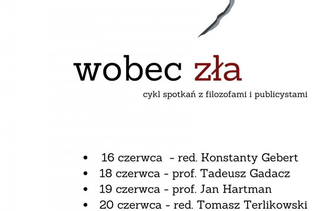 Z kolei 19 czerwca (godz. 17.30) gościem cyklu będzie prof. Jan Hartman (wykładowca Uniwersytetu Jagiellońskiego, filozof i etyk, a także publicysta, związany głównie z tygodnikiem „Polityka”. W pracy naukowej zajmuje się metafilozofią, filozofią polityki, etyką i bioetyką. Ostatnio ukazały się w wydawnictwie Austeria dwie jego książki „Spowiedź antychrysta” oraz „Zmierzch filozofii”).