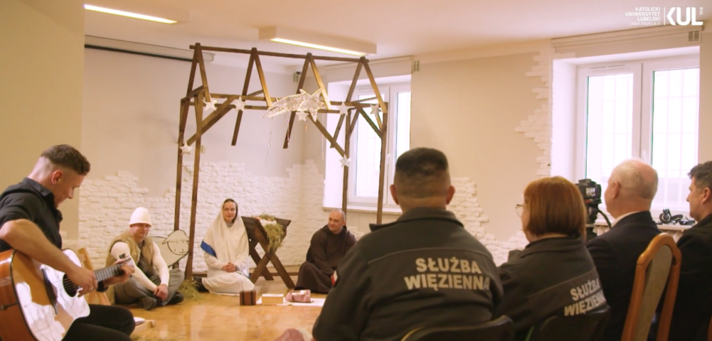 Fot. KUL, John Paul II Catholic University of Lublin/YouTubeKilkunastoosobowa grupa osadzonych odbywających karę pozbawienia wolności, w tym studenci KUL, którzy kształcą się w Centrum Studiów KUL dla Osadzonych przy Areszcie Śledczym w Lublinie, kapelan więzienny i wolontariuszki z lubelskiego Centrum Wolontariatu zagrali w jasełkach. – Dedykuję je mojej zmarłej żonie Ewelinie i córce Kindze, chciałbym, żeby zobaczyła jak gram Józefa – podkreślił Wojciech, jeden z więźniów.