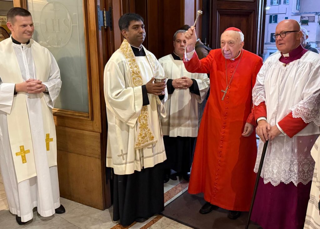 O. Joby Emmanuel, proboszcz parafii Świętych Aniołów Stróżów w Rzymie, powitał kardynała i wszystkich obecnych na uroczystości objęcia kościoła. „Dziś obchodzimy także niezwykły dar: jego 100 lat i 9 dni życia” – podkreślił proboszcz, dziękując kard. Acerbiemu za to, że przekazuje „pogodę ducha, przemawiającą do serca”.