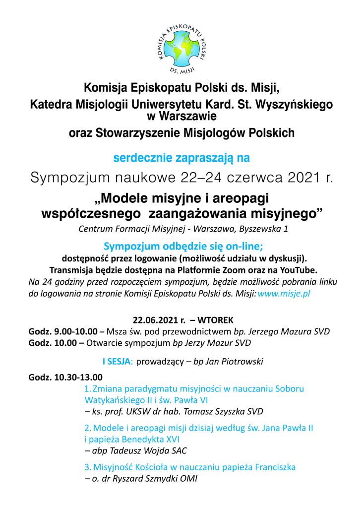 Materiały prasowe„Modele misyjne i areopagi współczesnego zaangażowania misyjnego” to tytuł sympozjum naukowego, które odbędzie się w dniach 22- 24 czerwca br. na Uniwersytecie Kardynała Stefana Wyszyńskiego w Warszawie. Sympozjum, które odbędzie się on-line, organizowane jest przez Komisję Episkopatu Polski ds. Misji, katedrę Misjologii UKSW w Warszawie oraz Stowarzyszenie Misjologów Polskich.