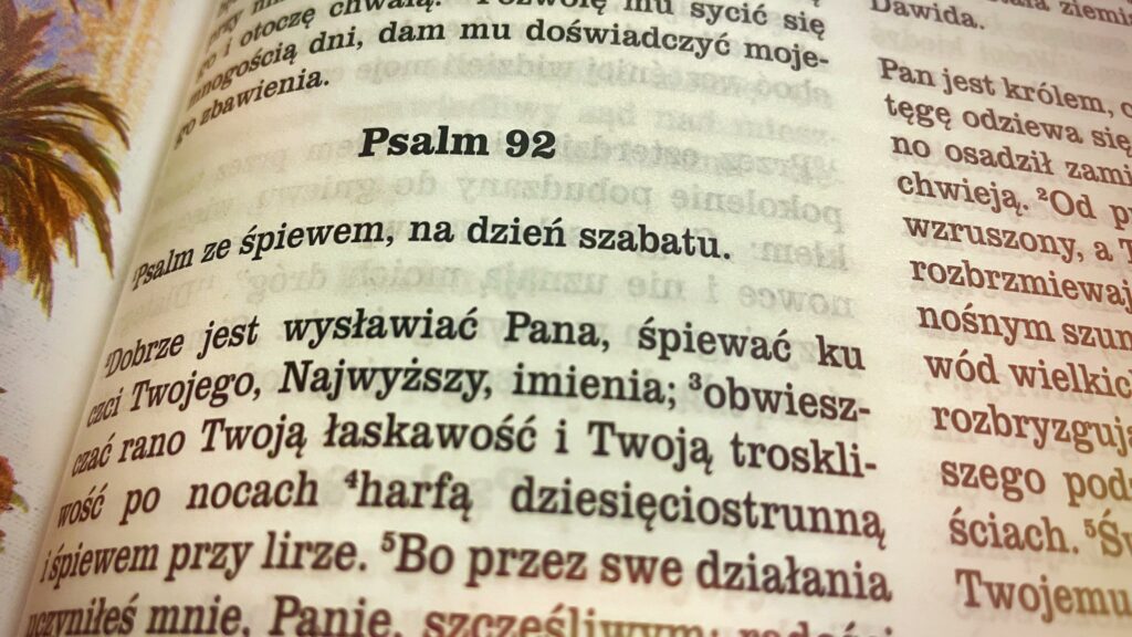 Psalm 92 jest poświęcony Szabatowi. „Oznacza to, że był on recytowany w Świątyni w dzień Szabatu, a dziś pojawia się także kilka razy w liturgii szabatowej, która rozpoczyna się w piątek wieczorem” – wyjaśnia dr Andrevon-Gottstein. Już dwa pierwsze wersety psalmu („Pieśń na dzień Szabatu. Dobrze jest dziękować Panu i śpiewać imieniu Twemu, o Najwyższy”) pokazują „podniosłość Szabatu w judaizmie, który jest czymś więcej niż tylko dniem odpoczynku”.