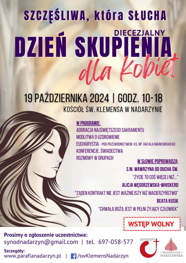 Materiały prasowe organizatorówW parafii pw. św. Klemensa w Nadarzynie obędzie się 19 października wyjątkowe spotkanie – Diecezjalny Dzień Skupienia dla Kobiet. W czasach zagubienia i niepewności, kobiety Kościoła chcą się nawzajem wspierać – rozmawiać i wspólnie szukać rozwiązać. Spotkanie odbędzie się pod hasłem: „Szczęśliwa, która słucha” pod patronatem metropolity warszawskiego kard. Kazimierza Nycza.