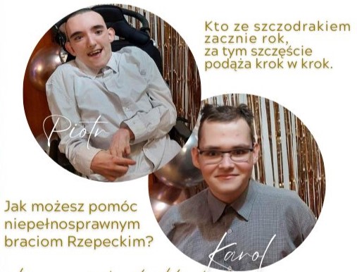22-letni Piotr cierpi na porażenie mózgowe czterokończynowe, padaczkę i refluks. Nie chodzi i nie siedzi samodzielnie, wymaga stałej opieki. 18-letni Karol urodził się z przepukliną oponowo-rdzeniową, wodogłowiem i pęcherzem neurogennym. Porusza się na aktywnym wózku.