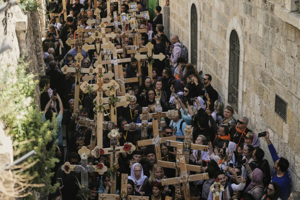 W Wielki Piątek na Starym Mieście w Jerozolimie dominowały krzyże: duże, małe, malowane, ozdobione kwiatami lub po prostu wykonane z drewna. Wcześnie rano setki chrześcijan przeszło przez Via Dolorosa – 14 stacji Drogi Krzyżowej do Bazyliki Grobu Pańskiego, aby upamiętnić Mękę Jezusa, od pojmania do ukrzyżowania i złożenia w grobie. Chociaż z powodu wojny drugi rok z rzędu nie było tam zagranicznych grup pielgrzymkowych, wierni tłoczyli się na wąskich uliczkach, a to dlatego, że w tym roku wszystkie wyznania obchodzą Wielkanoc w tym samym dniu.