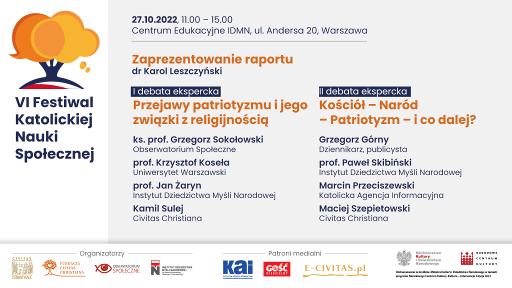 „Zjawisko patriotyzmu i nacjonalizmu w Polsce i ich związki z religijnością” – to tytuł raportu, któremu poświęcone będą debaty eksperckie organizowane w ramach VI edycji Festiwalu Katolickiej Nauki Społecznej. Debaty odbędą się 27 października br. w Warszawie. Poprzedzi je prezentacja raportu.