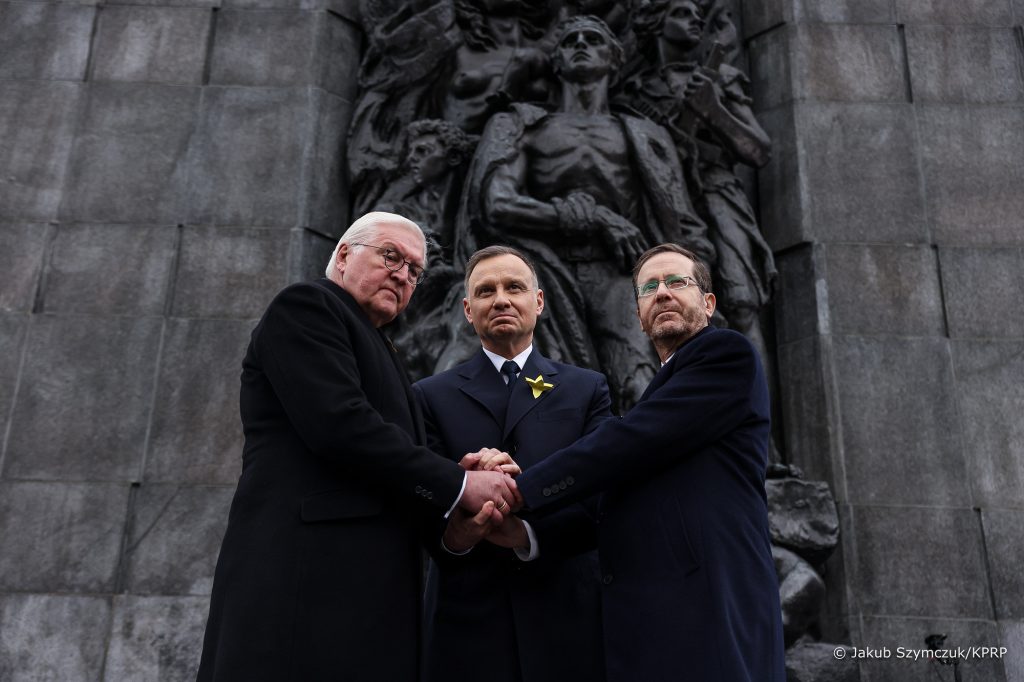 Pochylamy dzisiaj nisko głowę przed bohaterami powstania w getcie, wszystkimi, którzy przeciwko nienawiści walczyli o swoją godność. Uczestnicy powstania w getcie są niegasnącym przykładem męstwa, bohaterstwa, są symbolem odwagi, godności i męstwa jak lwy – powiedział prezydent Polski Andrzej Duda. W 80. rocznicę wybuchu powstania w getcie warszawskim wizytę w Polsce złożyli prezydent Państwa Izrael Isaac Herzog oraz prezydent Republiki Federalnej Niemiec Frank–Walter Steinmeier. Wspólnie z prezydentem Polski wzięli dziś udział w głównych obchodach rocznicy na pl. Bohaterów Getta Warszawskiego w Warszawie.