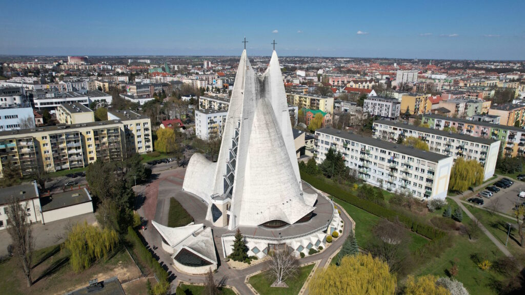 To prawdziwy unikat. Nie ma żadnych filarów i podpór. Przykrywa go jednorodna powłoka, betonowa łupina, która w najcieńszym miejscu ma zaledwie 6 cm grubości. Budowlę zaprojektowali bardzo młodzi architekci: błyskotliwy matematyk i student, a zbudowali własnymi rękami parafianie. Kościół Miłosierdzia Bożego w Kaliszu uznawany jest za ewenement na skalę światową.