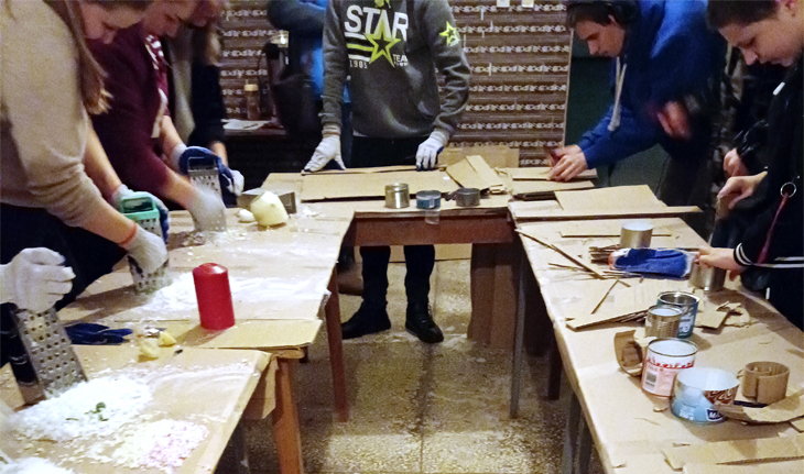 Wolontariusze Caritas i Ukraińcy robią świece okopowe dla żołnierzy