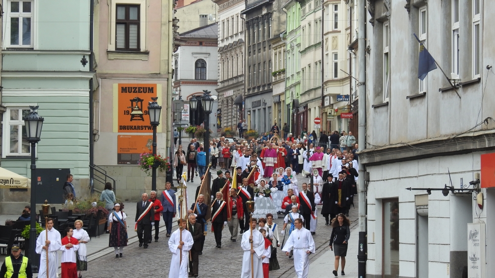Zanim rozpoczęła się Eucharystia w dawnej jezuickiej świątyni, ulicami Cieszyna i Czeskiego Cieszyna przeszła transgraniczna, barwna procesja z relikwiami św. Melchiora Grodzieckiego. Uczestniczyli w niej m.in. biskupi, księża, diakoni, klerycy, siostry zakonne, nadzwyczajni szafarze, przedstawiciele władz samorządowych, a także górale i Żywiecka Asysta.