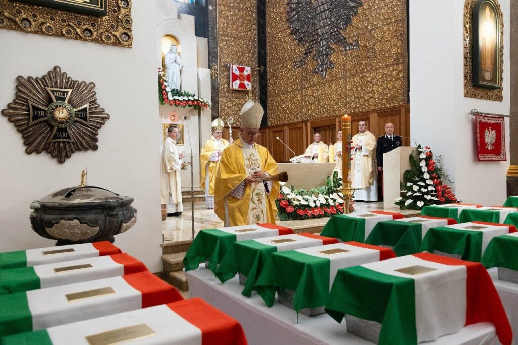 Fot. Krzysztof Stępkowski / Ordynariat PolowyW katedrze polowej Wojska Polskiego w Warszawie, 2 października odprawiona została Msza św. pogrzebowa w intencji włoskich żołnierzy poległych podczas II wojny światowej w obozie jenieckim Lamsdorf. Eucharystii przewodniczył nuncjusz apostolski w Polsce abp Antonio Guido Filipazzi, a koncelebrował biskup polowy Wiesław Lechowicz. Po liturgii szczątki żołnierzy zostały złożone na Cmentarzu Żołnierzy Włoskich w Warszawie.