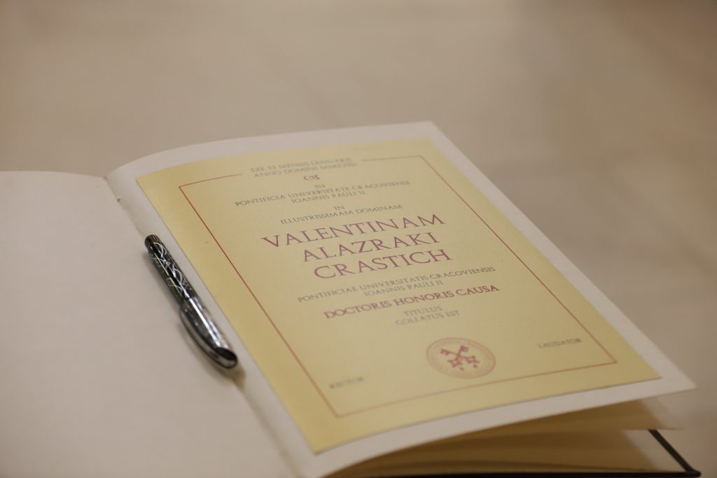W laudacji ks. prof. Michał Drożdż, dziekan Wydziału Nauk Społecznych UPJPII w Krakowie, podkreślał, że Valentina Alazraki służy swoją rzetelną i odpowiedzialną pracą dziennikarską „wszystkim papieżom jej życia”, ale szczególny szacunek i miłość okazała św. Janowi Pawłowi II. – Sama określiła siebie jako „Juanpablista” – przypominał. – Valentina Alazraki Crastich jest osobą, która traktuje swoją pracę jako misję dziennikarską w duchu prawdy i uczciwości, wypełniając ją jako służbę Bogu, Kościołowi i ludziom – dodał.