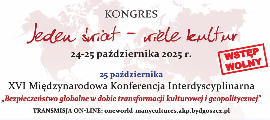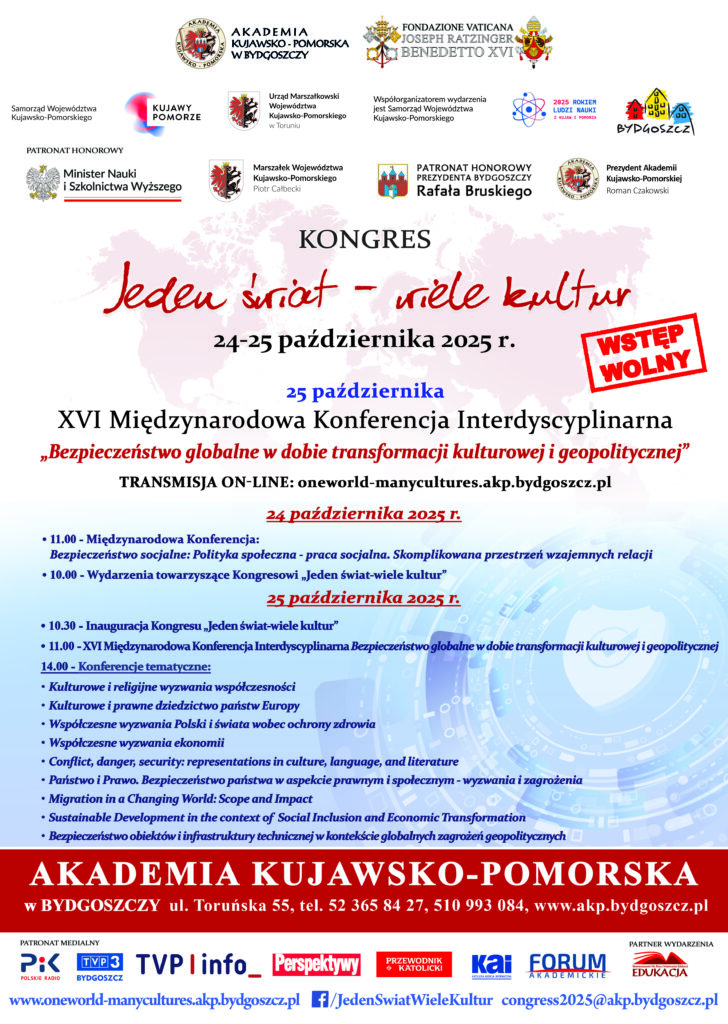 Akademia Kujawsko-Pomorska (wcześniej Kujawsko-Pomorska Szkoła Wyższa w Bydgoszczy) po raz szesnasty we współpracy z Fundacją Watykańską Joseph Ratzinger-Benedykt XVI, Urzędem Marszałkowskim Województwa Kujawsko-Pomorskiego oraz Urzędem Miasta Bydgoszcz będzie organizatorem XVI Międzynarodowej Konferencji Interdyscyplinarnej pt. Bezpieczeństwo globalne w dobie transformacji kulturowej i geopolitycznej w ramach Kongresu „Jeden Świat – Wiele Kultur”. Kongres odbędzie się w dniach 24-25 października 2025 roku w siedzibie Akademii Kujawsko-Pomorskiej przy ul. Toruńskiej  55–57 w Bydgoszczy. Tegoroczna edycja została objęta honorowym patronatem Ministerstwa Nauki i Szkolnictwa Wyższego.