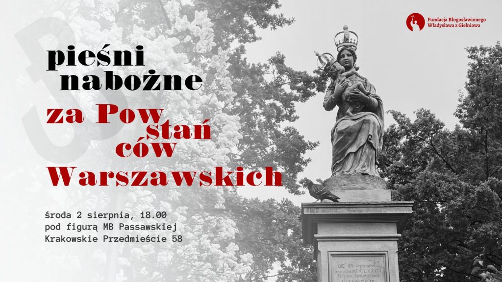 Materiały prasoweNa spotkanie śpiewacze pod hasłem „Śpiewamy pieśni nabożne za Powstańców Warszawskich” w środę 2 sierpnia o 18.00 zaprasza Fundacja bł. Władysława z Gielniowa. Dawne pieśni, które wybrzmią pod figurą Matki Boskiej Pasawskiej na Krakowskim Przedmieściu, będą modlitwą za poległych w wolnościowym zrywie.