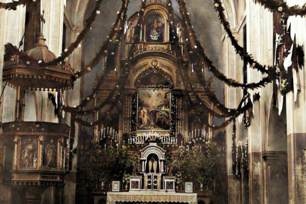 Wystrój wadowickiego kościoła karmelitów bosych z okazji dziękczynnego triduum za beatyfikację męczenniczek w 1906 r. (oryginały i kolorowane przez sztuczną inteligencję.Fot. archiwum ojców karmelitówW Positio ogłoszonej 18 grudnia przez Stolicę Apostolską kanonizacji równoważnej błogosławionych karmelitanek bosych z Compiègne nie brakuje wątku polskiego. W zebranych dokumentach znalazło się odniesienie do przetłumaczonej na polski książki A. Odona z 1906 roku, poświęconej męczeństwu 16 mniszek podczas rewolucji francuskiej oraz do triduum, jakie po ich beatyfikacji odbyło się staraniem św. Rafała Kalinowskiego w Wadowicach – zauważa o. Szczepan T. Praśkiewicz OCD, relator Dykasterii Spraw Kanonizacyjnych.