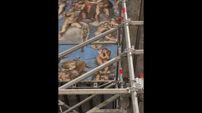 W sobotę 28 lutego w Watykanie zaprezentowano mediom kulisy operacji czyszczenia, która odbywa się na rusztowaniu sięgającym od podłogi po sufit i zasłaniającym monumentalny fresk przedstawiający niebo i piekło, dominujący nad przednią ścianą kaplicy.