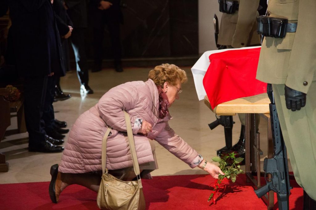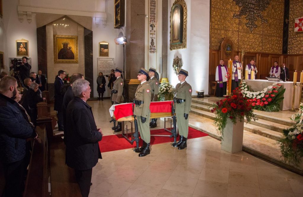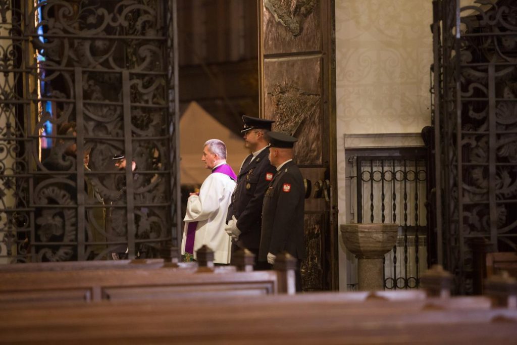 Okryta biało-czerwoną flagą trumna, została zdjęcia z lawety i wniesiona do katedry przez żołnierzy Pułku Reprezentacyjnego WP. Przed ołtarzem został umieszczony portret zmarłego marszałka seniora.