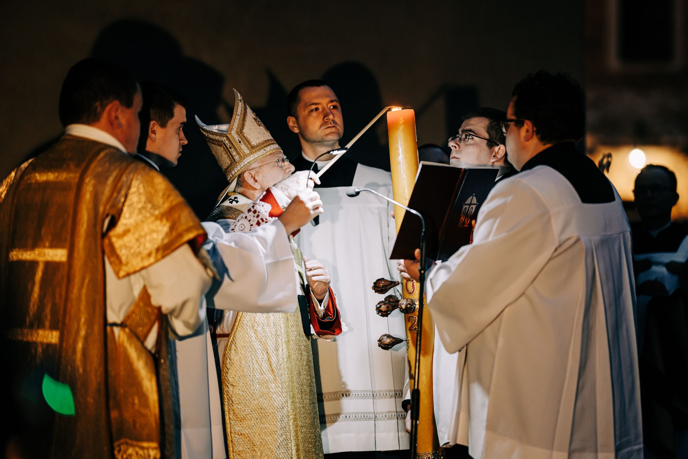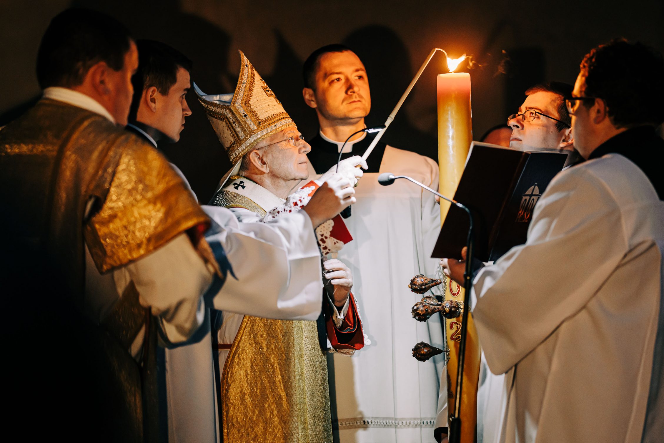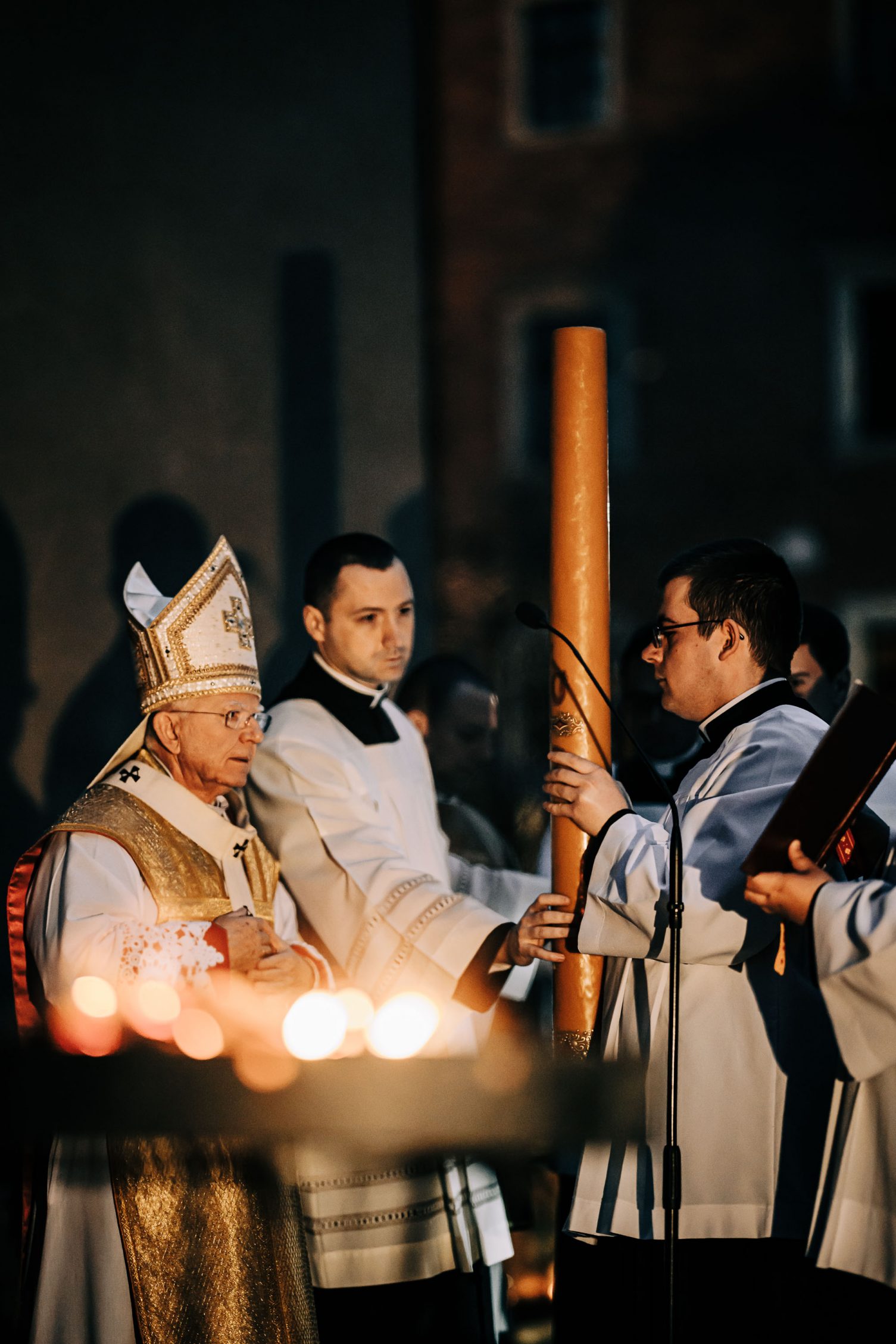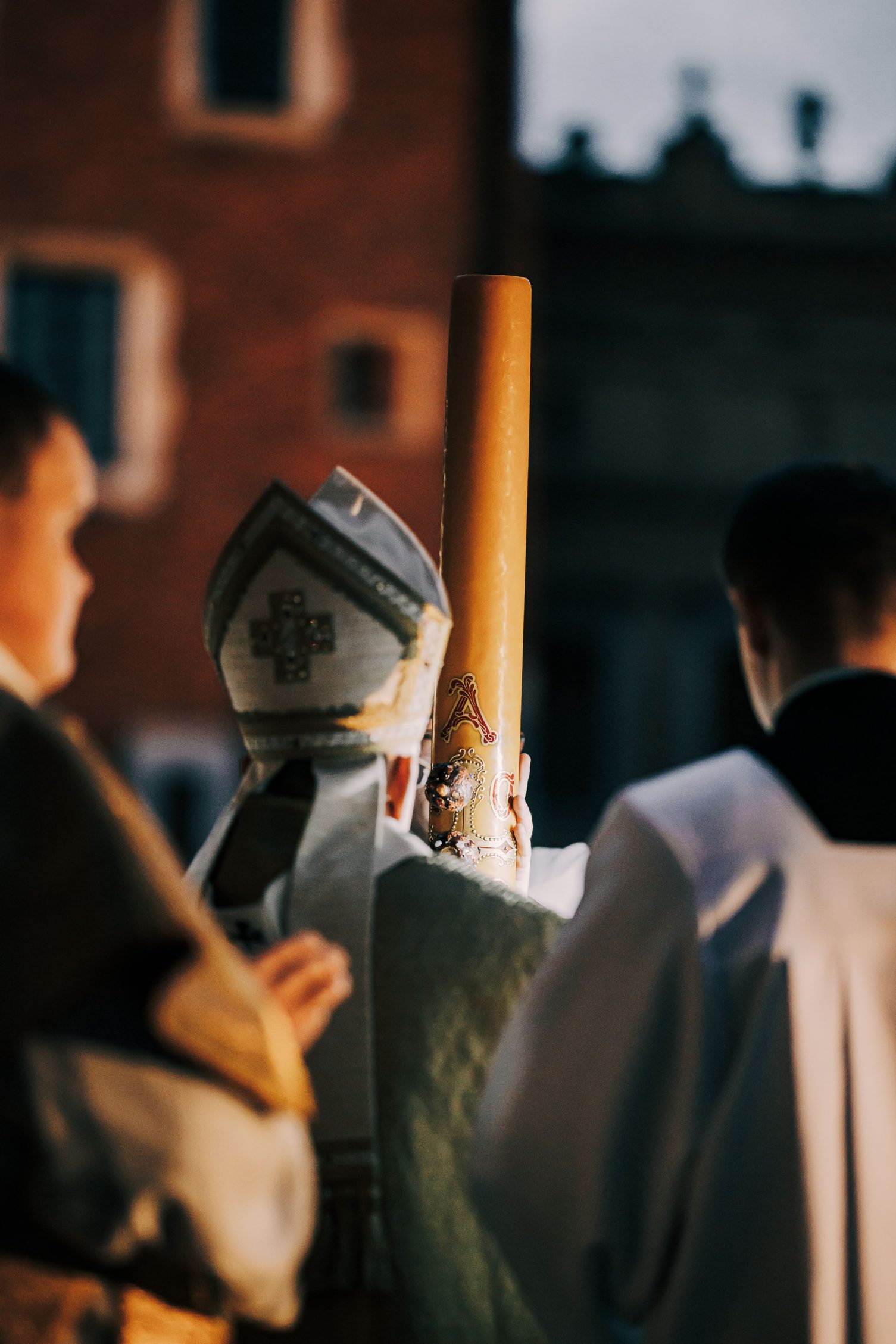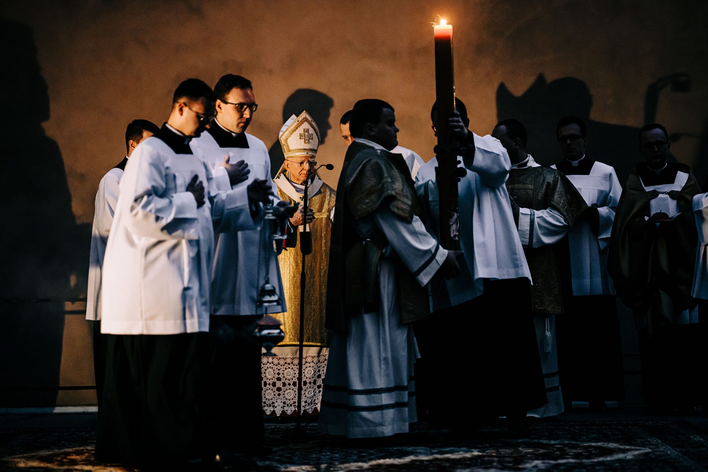 Fot. Piotr TumidajskiWielkanoc zaczyna się już w sobotę po zachodzie słońca. Rozpoczyna ją liturgia światła. Na zewnątrz kościoła kapłan święci ogień, od którego następnie zapala się Paschał – wielką woskową świecę, która symbolizuje zmartwychwstałego Chrystusa.
