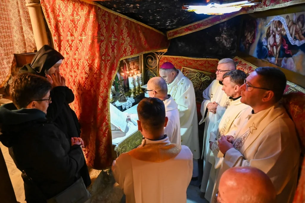 W Bazylice Narodzenia Pańskiego modliła się grupa pielgrzymów z diecezji bydgoskiej. – Stoimy w miejscu, gdzie „Słowo stało się ciałem i zamieszkało między nami”. W tej grocie Bóg wszedł w historię człowieka nie z mocą pałaców, lecz w ciszy, ubóstwie i pokorze. Tak spełniła się zapowiedź proroka Izajasza: „Naród kroczący w ciemnościach ujrzał światłość wielką”. Tą światłością jest Dziecko z Betlejem – Bóg bliski, Emmanuel – mówił ks. Krzysztof Kozłowski, który wygłosił homilię.