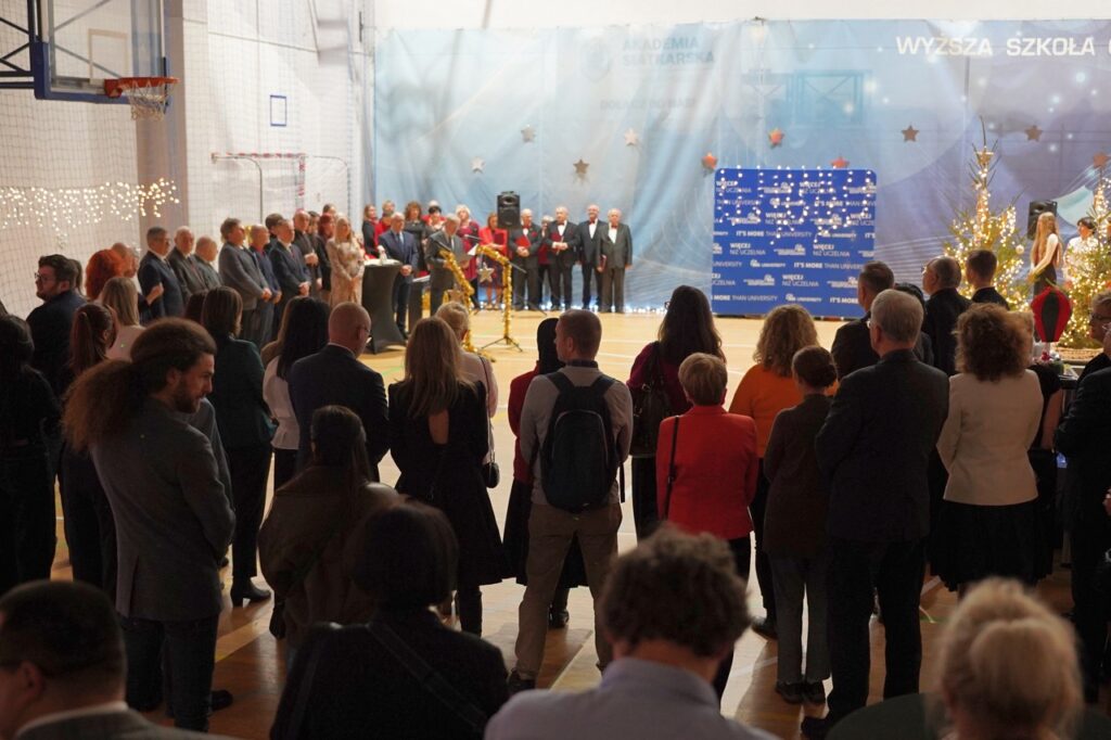 Fot. Wiesław Kajdasz/Biuro Prasowe Diecezji BydgoskiejHala sportowo-widowiskowa bydgoskiej Wyższej Szkoły Gospodarki była miejscem akademickiej wigilii, która zgromadziła rektorów, przedstawicieli uczelni, wykładowców, studentów, zaproszonych gości – w tym władze miasta. – Odkrywamy zdolności, talenty, charyzmaty, którymi służymy innym. Jednocześnie przyjmujemy w pokorze, że nasze możliwości są ograniczone, jest Ktoś większy od nas – mówił do zebranych biskup bydgoski Krzysztof Włodarczyk.