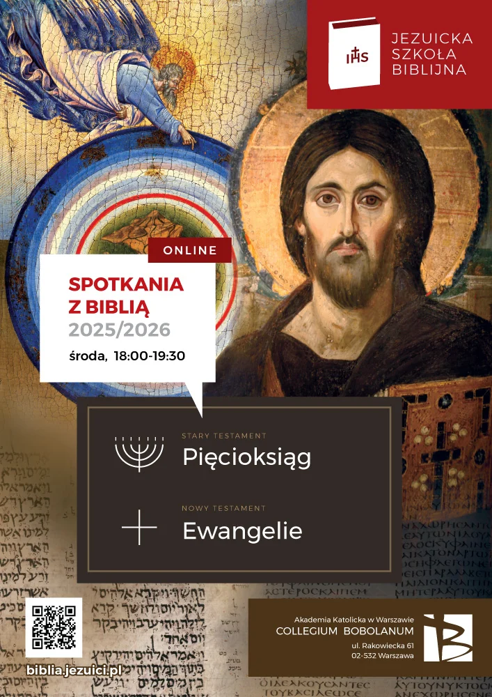 Spotkania biblijne odbywają się w środy o godz. 18:00-19:30 w Auli Wielkiej Collegium Bobolanum przy ul. Rakowieckiej 61. Pierwsze spotkanie rozpocznie się 8 października. Zajęcia będą prowadzone hybrydowo – zarówno na żywo jak i transmitowane w sieci. Wszyscy są bardzo mile widziani.