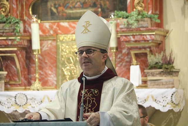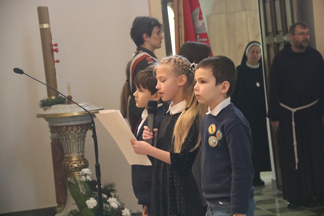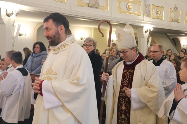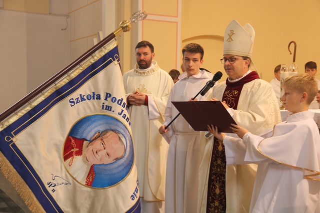 Przekonywał, że sztandar przypomina nie tylko o patronie, ale także o ojczyźnie i ważnych wartościach. – Niech ten sztandar towarzyszy wam w ważnych uroczystościach, które będziecie przeżywali w waszej szkole. Może warto znaleźć dobre miejsce dla sztandaru w szkole, żeby był widoczny gdy w normalnym rytmie pracy szkoły będziecie obok niego przychodzić, żeby wam przypominał o tych ważnych wartościach, które niósł święty wasz patron i które są zawarte w tych symbolach na sztandarze – akcentował bp Bryl.