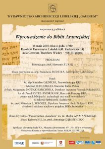 Wydawnictwo Archidiecezji Lubelskiej „Gaudium” i Katolicki Uniwersytet Lubelski Jana Pawła II mają zaszczyt zaprosić na promocję nowej publikacji Wprowadzenie do Biblii Aramejskiej. Promocja odbędzie się 16 maja 2018 roku o godz. 17.00 w auli Centrum Transferu Wiedzy KUL (408, III piętro, Al. Racławickie 14, Lublin). Spotkanie poprowadzi prof. dr hab. Sławomir Żurek, Dyrektor Międzynarodowego Ośrodka Badań nad Historią i Dziedzictwem Kulturowym Żydów Europy Środkowej i Wschodniej KUL. W panelu dyskusyjnym wezmą udział: ks. abp Stanisław Gądecki, Przewodniczący Konferencji Episkopatu Polski; Michael Schudrich, Naczelny Rabin Polski; dr hab. Małgorzata Nowak-Barcińska, Dyrektor Instytutu Filologii Polskiej KUL; ks. dr Paweł Rytel-Andrianik, Rzecznik Prasowy Konferencji Episkopatu Polski, doktor nauk biblijnych i archeologii oraz nauk orientalnych w zakresie hebraistyki i judaistyki; ks. prof. Mirosław S. Wróbel, Dyrektor Instytutu Nauk Biblijnych KUL, dyrektor i redaktor naukowy projektu Biblia Aramejska. Swoją obecnością zaszczycą nas m.in. ks. abp Stanisław Budzik, Metropolita Lubelski, i ks. prof. Antoni Dębiński, Rektor KUL. Spotkanie uświetnią dzieła W.A. Mozarta (Divertimento KV 136 i 137) w wykonaniu Wieniawski Kwartet z wprowadzeniem Teresy Księskiej-Falger.