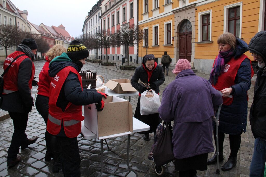 O poranku paczki z produktami spożywczymi pobłogosławił metropolita wrocławski. W każdej z nich znalazło się prawie 30 produktów. To artykuły, które można spożyć od razu po wyjęciu z paczki m.in. konserwy, krokiety, pierogi, karton mleka, bochenek świeżego chleba oraz słodycze. Potrzebujący otrzymali także opłatek.