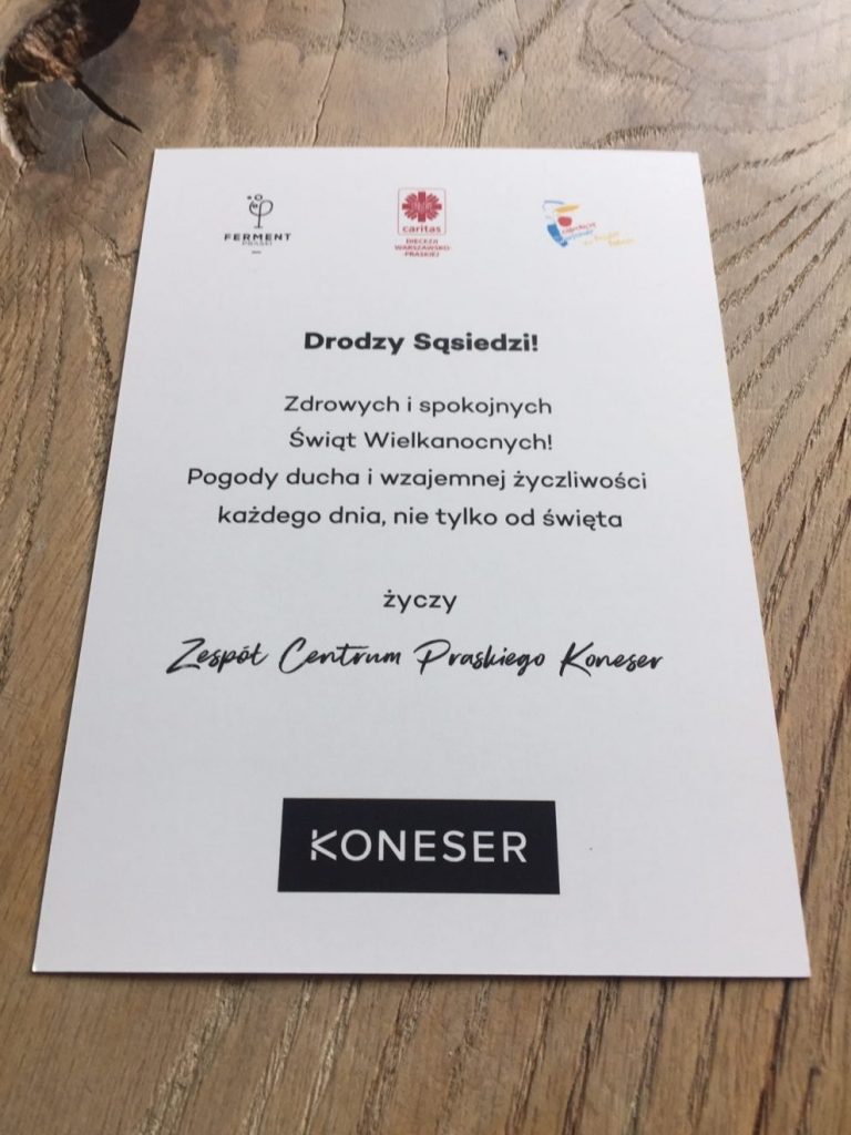 Kolejny projekt pomocowy zrealizowały Centrum Praskie Koneser wraz z Caritas Diecezji Warszawsko-Praskiej i Urzędem Dzielnicy Praga-Północ m.st. Warszawy przygotowali świąteczne paczki dla stu najbardziej potrzebujących mieszkańców Pragi-Północ. Pomoc trafiła bezpośrednio oraz bezkontaktowo do domów osób starszych i chorych. W ramach akcji paczki z tradycyjnymi potrawami wielkanocnymi trafiły do 100 najbardziej potrzebujących mieszkańców Pragi-Północ. Seniorzy otrzymali m.in. żurek z jakiem i kiełbasą, sałatkę jarzynową, pieczeń rzymską, faszerowane jajka oraz babkę piaskową i święconkę przygotowaną przez Caritas Diecezji Warszawsko-Praskiej i jej partnerów. Posiłki przygotowała restauracja Ferment Praski, która na co dzień funkcjonuje w Centrum Praskim Koneser. Z kolei Caritas Diecezji Warszawsko-Praskiej razem z Urzędem Dzielnicy Praga-Północ m.st. Warszawy zadbają o bezkontaktową dystrybucję paczek.