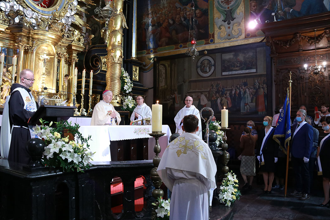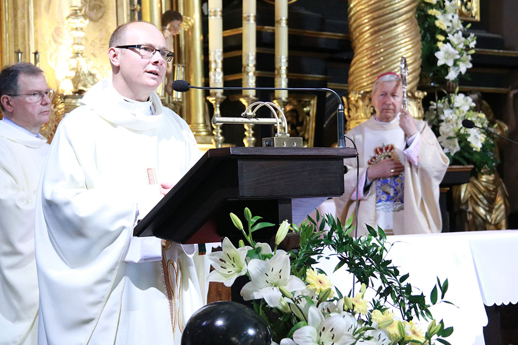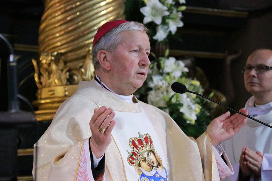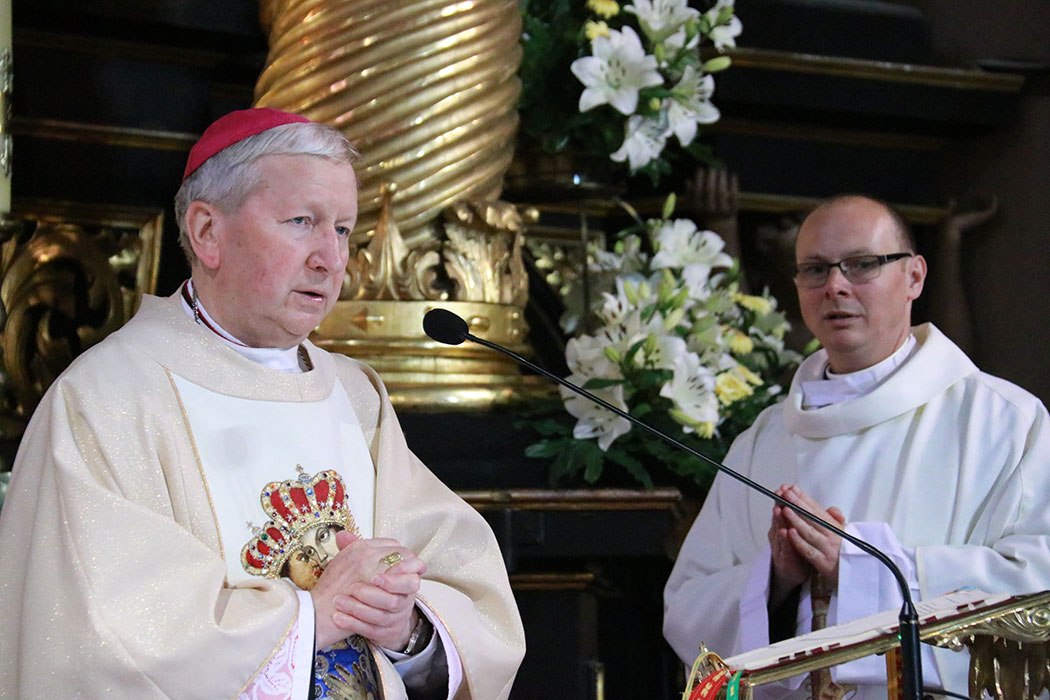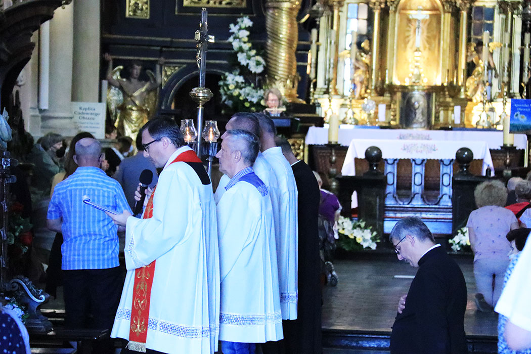 – Nasze drogi apostolskie również prowadzą do Wieczernika Eucharystii, aby tam nabrać mocy Bożej w drodze do Domu Ojca, aby przez modlitwę i ofiarną miłość wypraszać wytrwałość w wierności Chrystusowi Panu i Kościołowi dla wszystkich kapłanów – mówił. Obecność Maryi w niebie jest zachętą do wpatrywania się w wieczność i szukania pomocy w jej orędownictwie. – W drodze do Ołtarza ofiary krzyżowej i do stołu Uczty Eucharystycznej, na początku nowego etapu drogi apostolstwa modlitwy i czynu miłosierdzia, wpatrując się w macierzyńskie oblicze Matki tulące oblicze swego Syna, wołajmy: „Przeto orędowniczko nasza, one miłosierne oczy Twoje na nas zwróć, a Jezusa, błogosławiony owoc żywota Twojego, po tym wygnaniu nam okaż, o łaskawa, o litościwa, o słodka Panno Maryjo” – zakończył biskup.