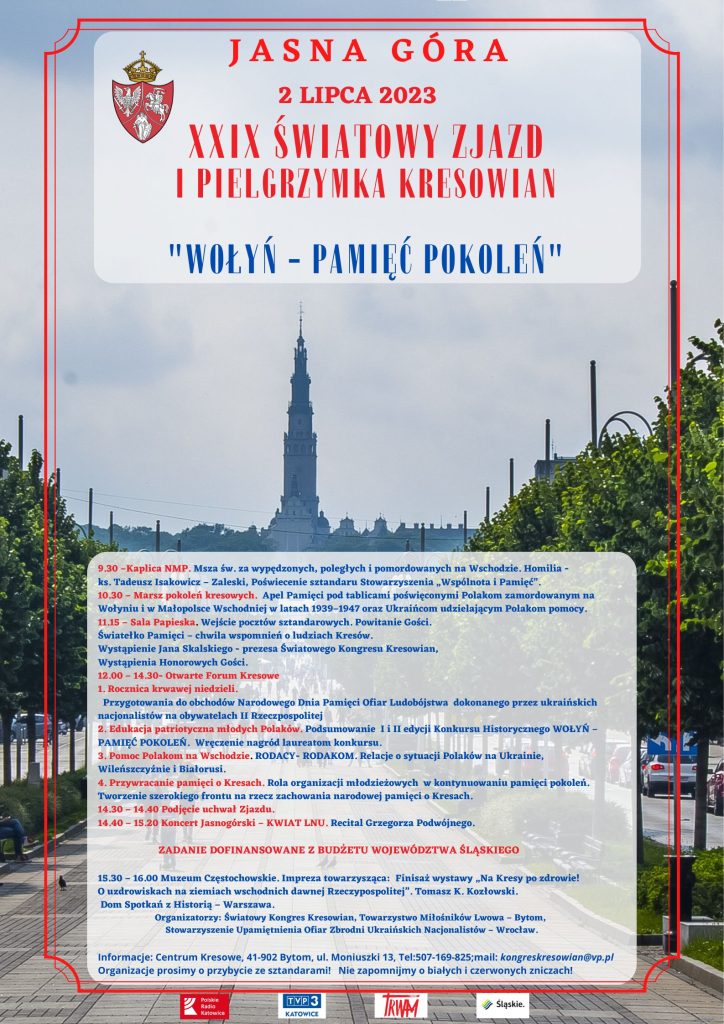 Fot. kresowianie.comXXIX Światowy Zjazd i Pielgrzymka Kresowian odbędzie się 2 lipca na Jasnej Górze. Organizatorem wydarzenia jest Światowy Kongres Kresowian, Towarzystwo Miłośników Lwowa – Bytom, Stowarzyszenie Upamiętnienia Ofiar Zbrodni Ukraińskich Nacjonalistów – Wrocław.