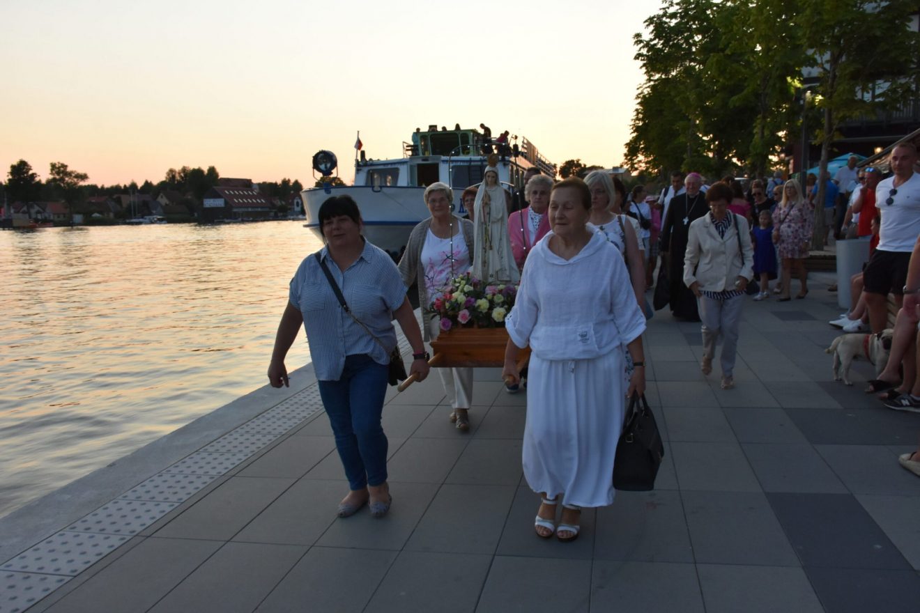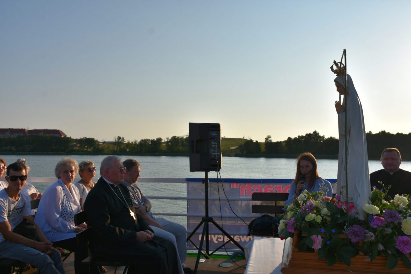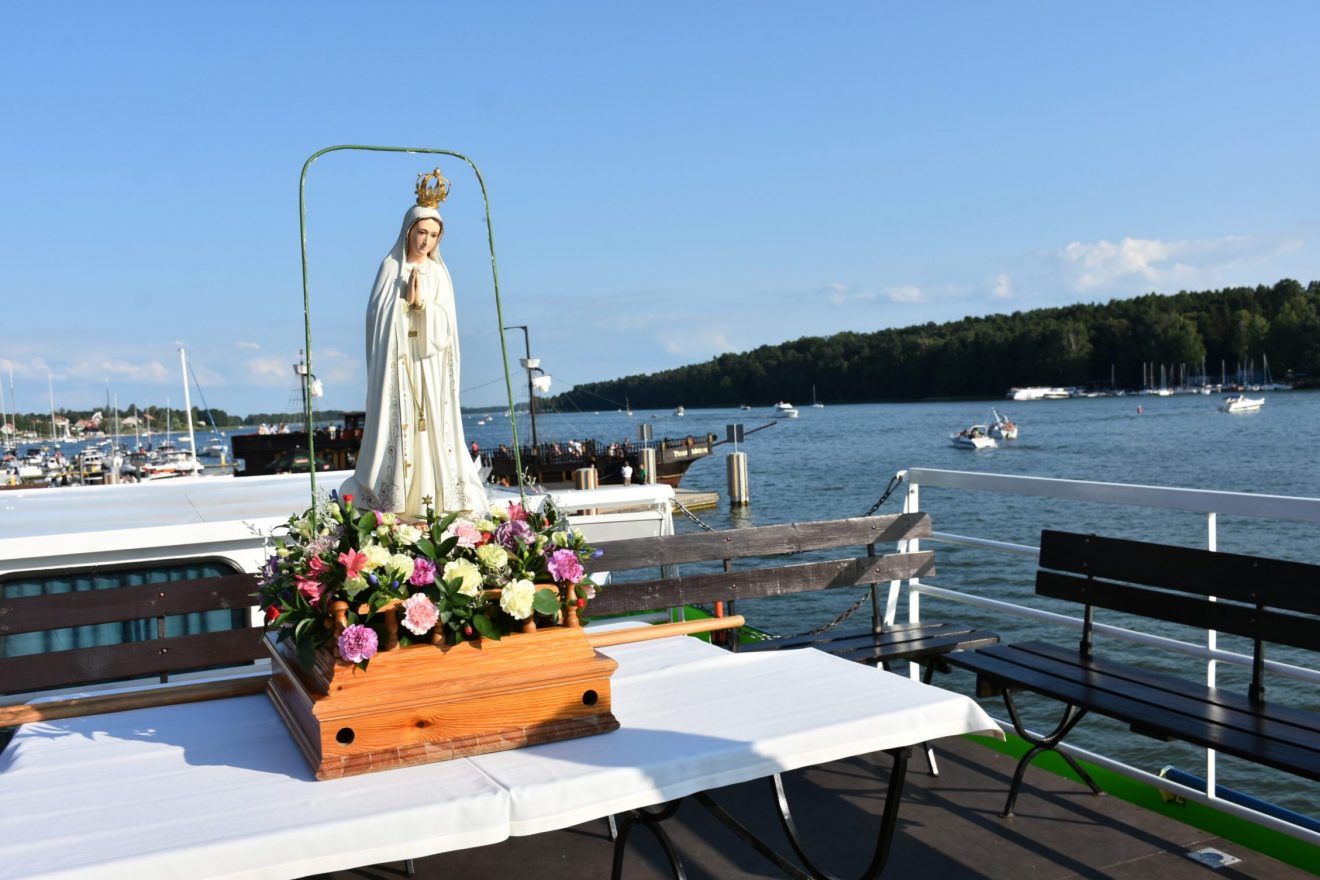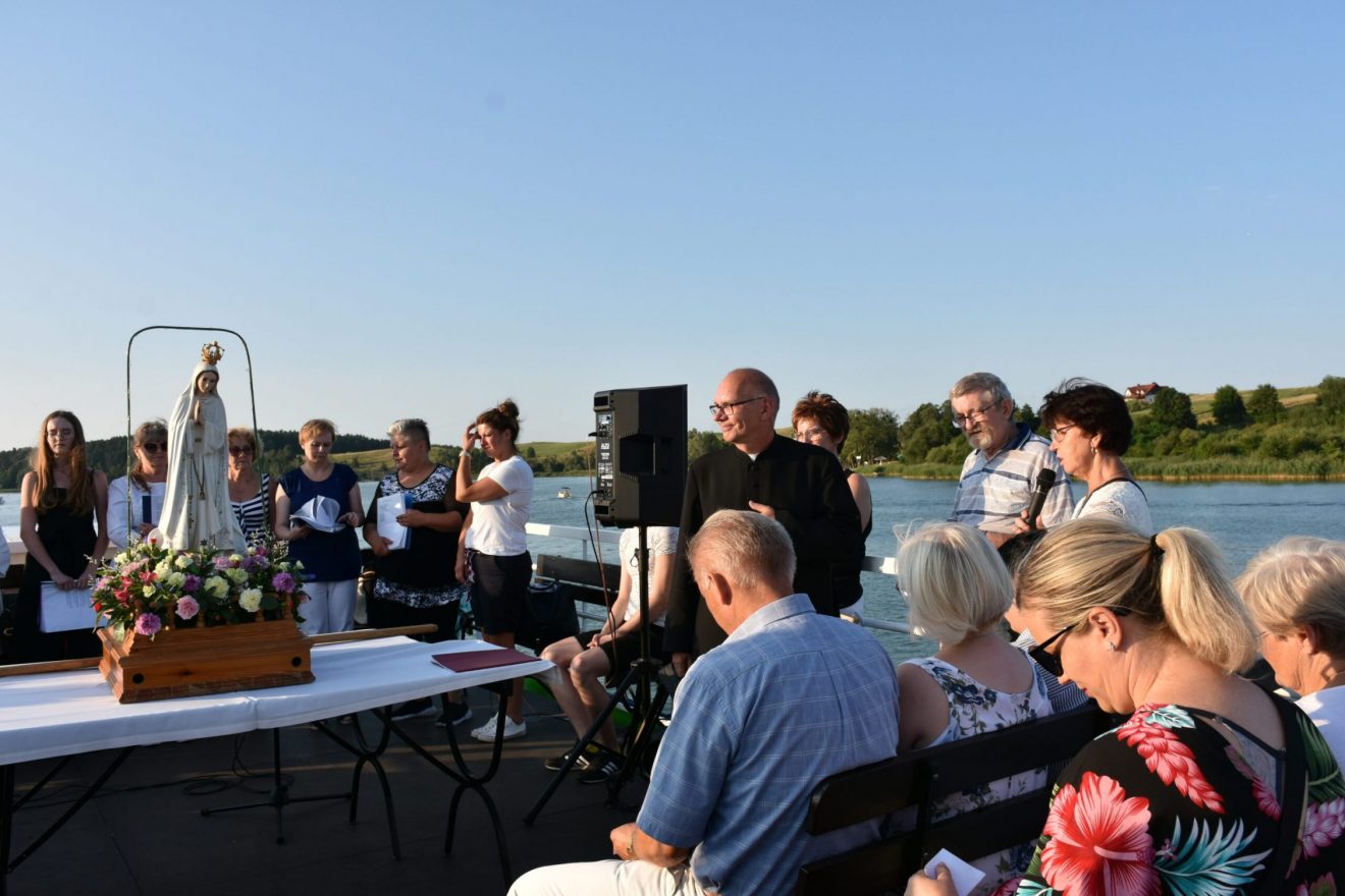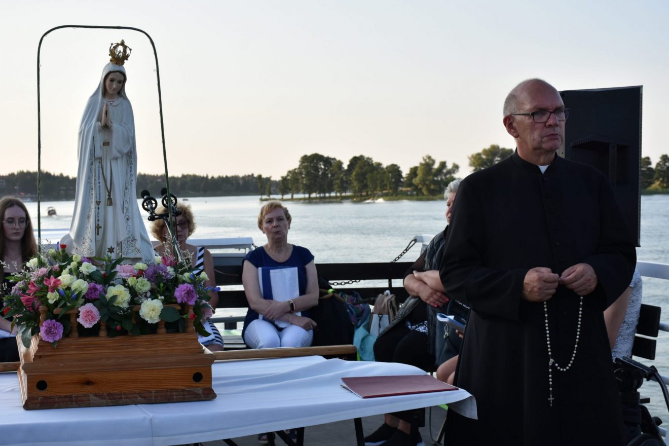 Uczestnicy wydarzenia zostali przyjęci na pokład statków „Gałczyński” i „Wigry”. Dołączyły też mniejsze jednostki pływające. „Płyniemy z „Maryją na Jeziorach”, która jest obecna w znaku figury Matki Bożej Fatimskiej. Przesłanie Matki Bożej z Fatimy możemy streścić w trzech słowach: nawracajcie się, czyńcie pokutę, odmawiajcie różaniec. Maryja też do nas dzisiaj, tak jak do dzieci fatimskich zwraca się z pytaniem: „czy chcecie ofiarować się Bogu, aby zadośćuczynić za grzechy i wyprosić łaskę nawrócenia dla innych?” – pytał bp Mazur.