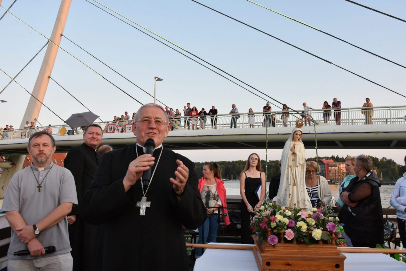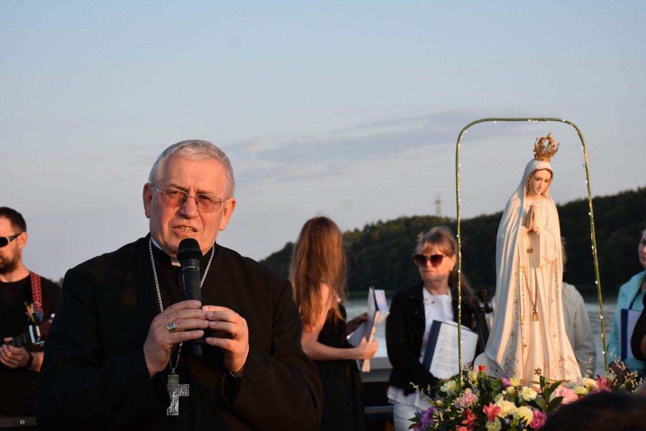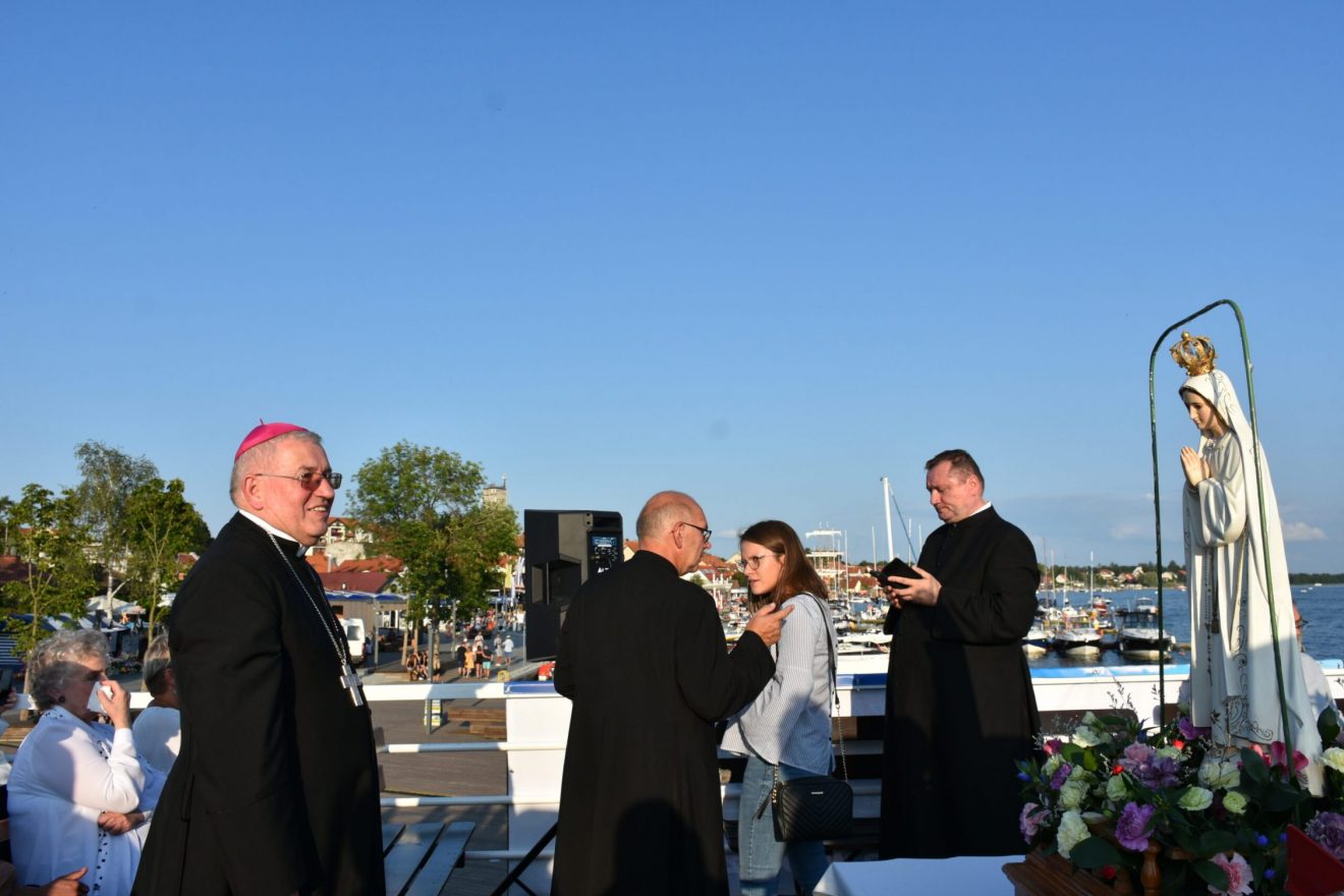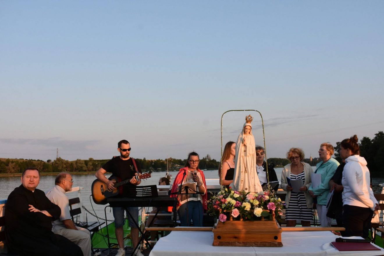 Uczestnicy wydarzenia zostali przyjęci na pokład statków „Gałczyński” i „Wigry”. Dołączyły też mniejsze jednostki pływające. „Płyniemy z „Maryją na Jeziorach”, która jest obecna w znaku figury Matki Bożej Fatimskiej. Przesłanie Matki Bożej z Fatimy możemy streścić w trzech słowach: nawracajcie się, czyńcie pokutę, odmawiajcie różaniec. Maryja też do nas dzisiaj, tak jak do dzieci fatimskich zwraca się z pytaniem: „czy chcecie ofiarować się Bogu, aby zadośćuczynić za grzechy i wyprosić łaskę nawrócenia dla innych?” – pytał bp Mazur.
