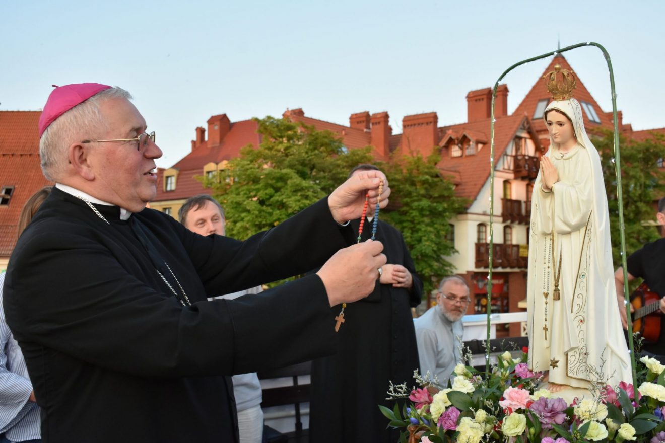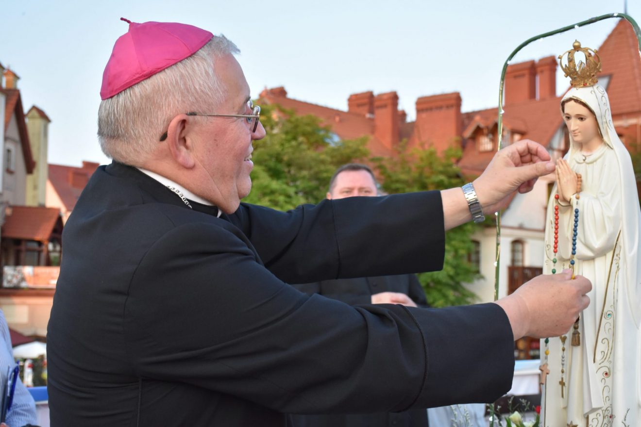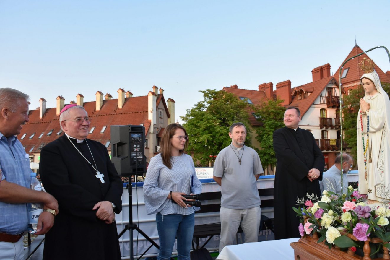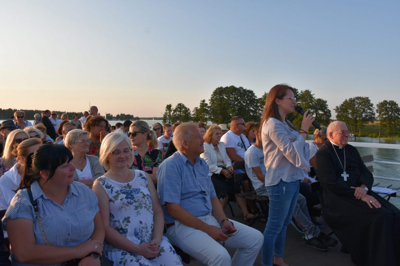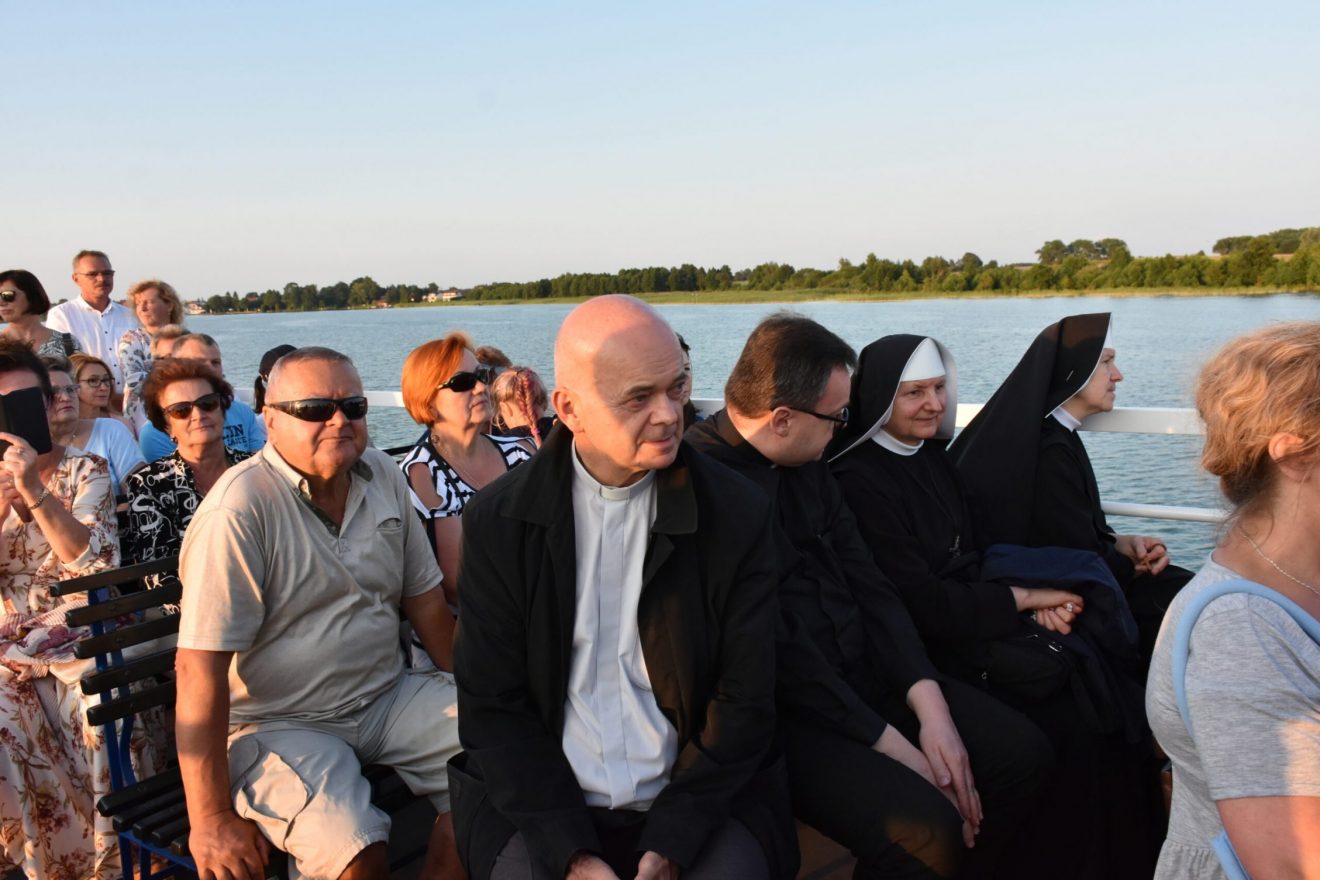 Uczestnicy wydarzenia zostali przyjęci na pokład statków „Gałczyński” i „Wigry”. Dołączyły też mniejsze jednostki pływające. „Płyniemy z „Maryją na Jeziorach”, która jest obecna w znaku figury Matki Bożej Fatimskiej. Przesłanie Matki Bożej z Fatimy możemy streścić w trzech słowach: nawracajcie się, czyńcie pokutę, odmawiajcie różaniec. Maryja też do nas dzisiaj, tak jak do dzieci fatimskich zwraca się z pytaniem: „czy chcecie ofiarować się Bogu, aby zadośćuczynić za grzechy i wyprosić łaskę nawrócenia dla innych?” – pytał bp Mazur.