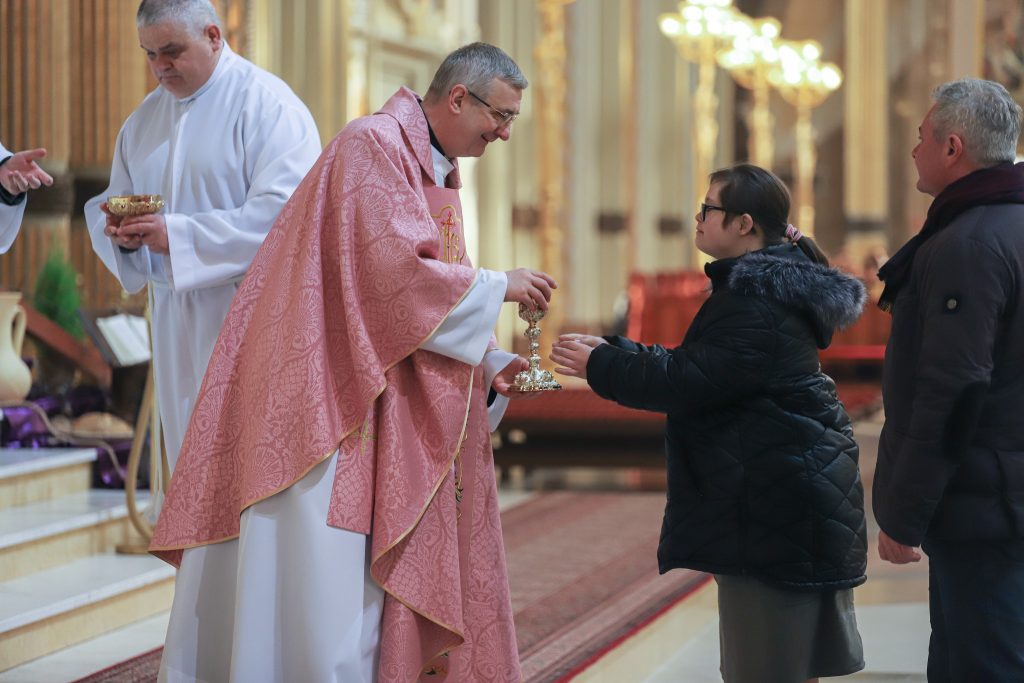 W homilii marianin zwrócił się bezpośrednio do obecnych osób dotkniętych zespołem Downa. – Dziękujemy za to, że jesteście z nami, za to, co przynosicie światu poprzez swoje istnienie. W każdym momencie swojego życia uczycie nas spontanicznej radości, bezinteresownego uśmiechu, który pojawia się natychmiast, gdy spotykacie drugą osobę. Takiej bezinteresownej radości potrzeba dziś światu, który zapomniał, że jej źródłem jest samo życie, istnienie. Osoby z dodatkowym chromosomem otwierają nam oczy na inny świat, że miłość może być bezgraniczna i bezinteresowna. Pokazują, jak spotykać się z ludźmi, przełamywać dystans – zauważył zakonnik. – Bóg patrzy na świat oczami osób z zespołem Downa. Patrzy z bezinteresowną miłością, z radością. Nie kalkuluje. Widzi w każdym z nas arcydzieło. Jest pełen zachwytu, podziwu.