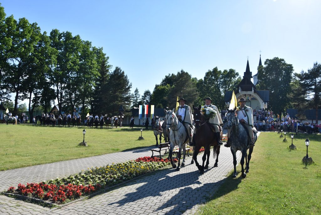 Fot. Jan GłąbińskiBlisko 90 jeźdźców z banderii konnej w strojach regionalnych przyjechało w niedzielę 12 czerwca do Ludźmierza na zakończenie obchodów 25. rocznicy pielgrzymki Jana Pawła II. Była wspólna modlitwa różańcowa i złożenie bukietów kwiatów przy figurze Jana Pawła II, do której jeźdźcy podjechali konno.