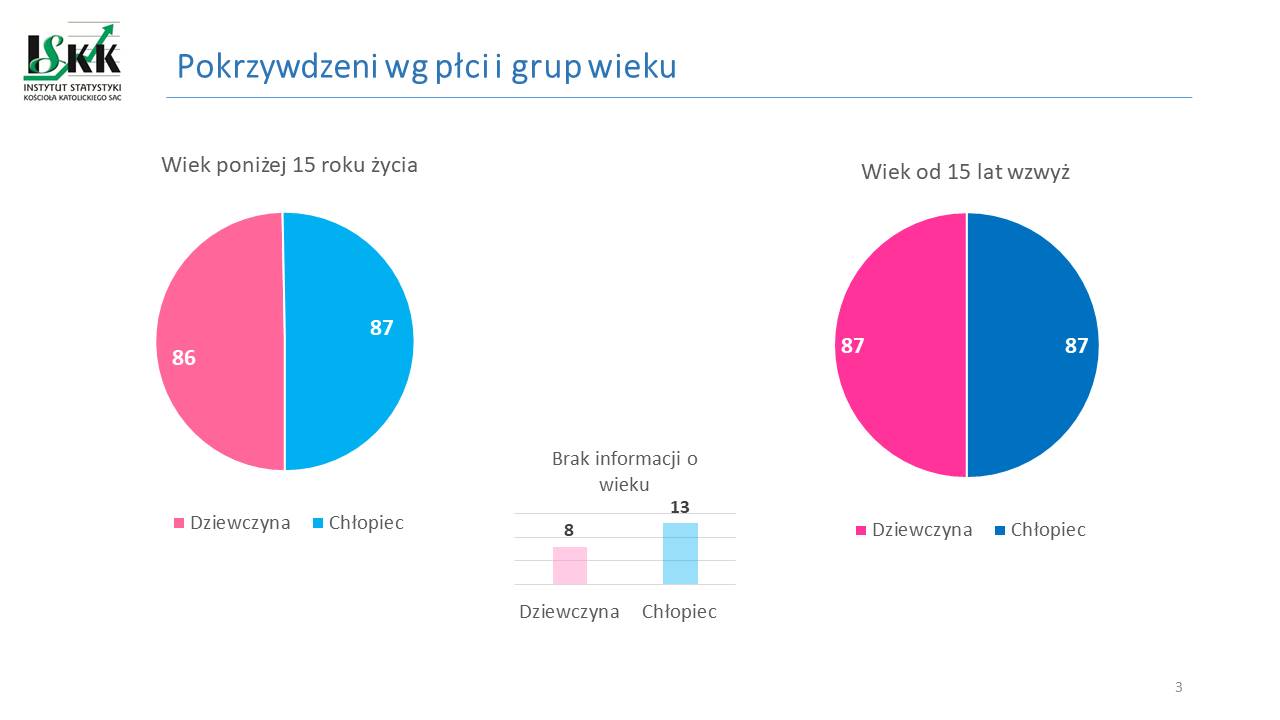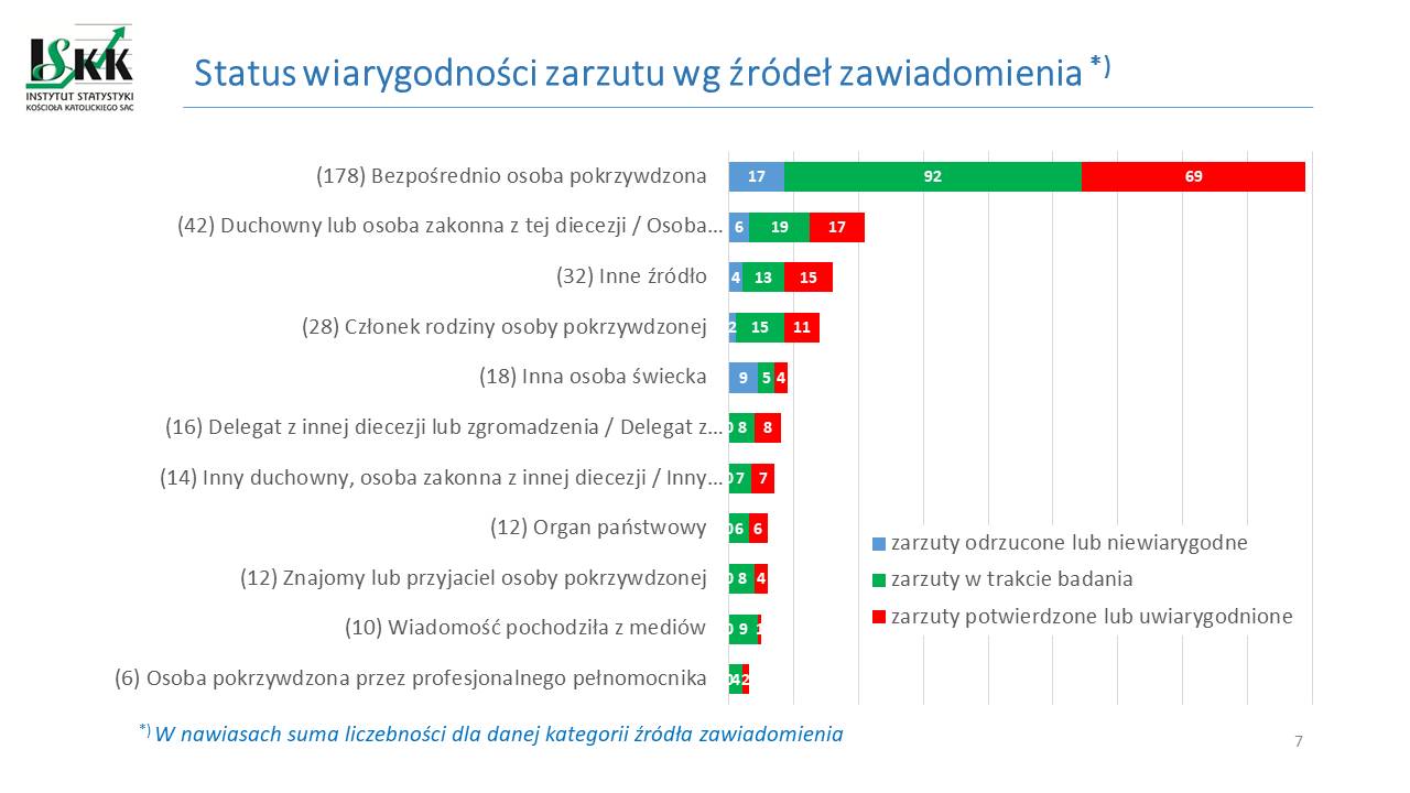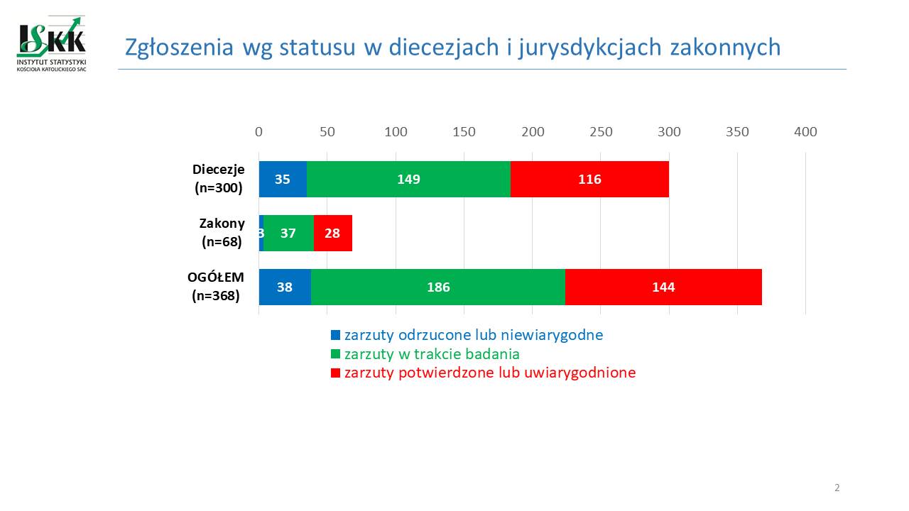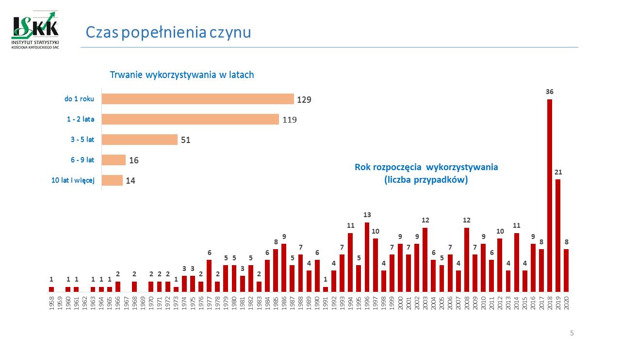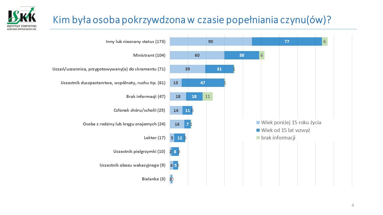 Z badań zaprezentowanych przez ks. Wojciecha Sadłonia  SAC, dyrektora ISKK wynika, że od połowy 2018 r. do końca 2020 r. dokonano 300 zgłoszeń wykorzystania seksualnego w diecezjach oraz 68 w zakonach. Blisko połowa osób pokrzywdzonych, których one dotyczyły, miało poniżej 15 roku życia (47%) oraz również niemal połowa  między 15 a 18 rokiem życia (47,3%). W obydwu grupach wiekowych udział chłopców i dziewcząt był taki sam (po 50%). 21 zgłoszeń (5,7%) nie zawiera informacji na temat wieku: 8 dotyczących wykorzystywania dziewcząt, 13  chłopców.