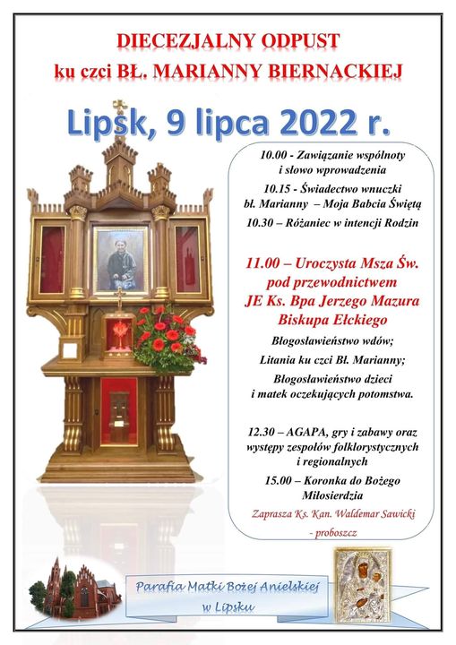 Fot. Renata RóżańskaDoroczne Diecezjalne Spotkanie Teściowych i Kół Gospodyń Wiejskich Diecezji Ełckiej odbędzie się w sobotę 9 lipca w sanktuarium Matki Bożej Bazylianki w Lipsku nad Biebrzą, skąd pochodzi szczególna teściowa – bł. Marianna Biernacka. Biskup ełcki Jerzy Mazur oraz gospodarz miejsca ks. kan. Waldemar Sawicki, proboszcz parafii pw. Matki Bożej Anielskiej w Lipsku, zapraszają na uroczystości odpustowe.